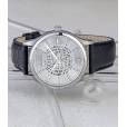 На черном фоне циферблата расположены накладные метки и стрелки с люминесцентным покрытием, которое обеспечивает отличную читаемость времени даже в условиях недостаточной освещённости. Диаметр корпуса составляет 43 мм, что делает часы достаточно заметными на запястье, но при этом не громоздкими.