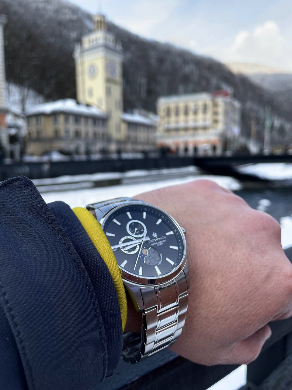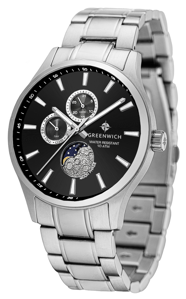 Элегантные наручные часы Greenwich Moon Walker представляют собой гармоничное сочетание спортивного дизайна и классических линий. Корпус часов выполнен из высококачественной нержавеющей стали, что обеспечивает долговечность и надёжность конструкции. Кварцевый механизм обеспечивает точный ход, отображая не только время, но и дату, день недели, а также фазы луны благодаря специальному индикатору в позиции «6 часов».