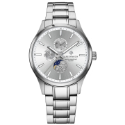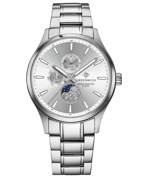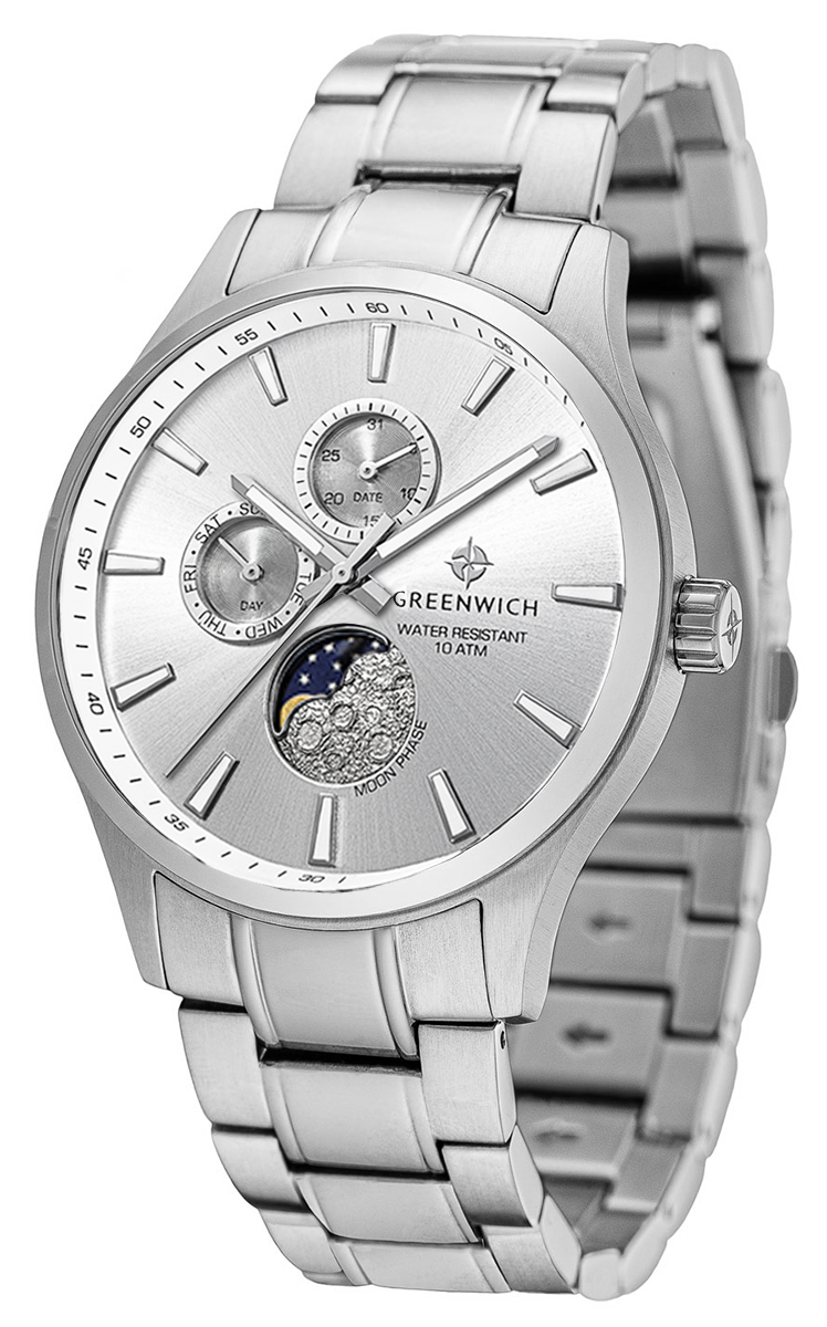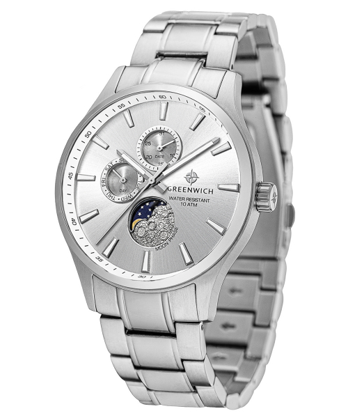 Элегантные наручные часы Greenwich Moon Walker представляют собой гармоничное сочетание спортивного дизайна и классических линий. Корпус часов выполнен из высококачественной нержавеющей стали, что обеспечивает долговечность и надёжность конструкции. Кварцевый механизм обеспечивает точный ход, отображая не только время, но и дату, день недели, а также фазы луны благодаря специальному индикатору в позиции «6 часов».