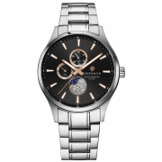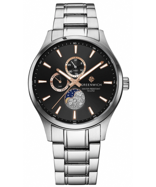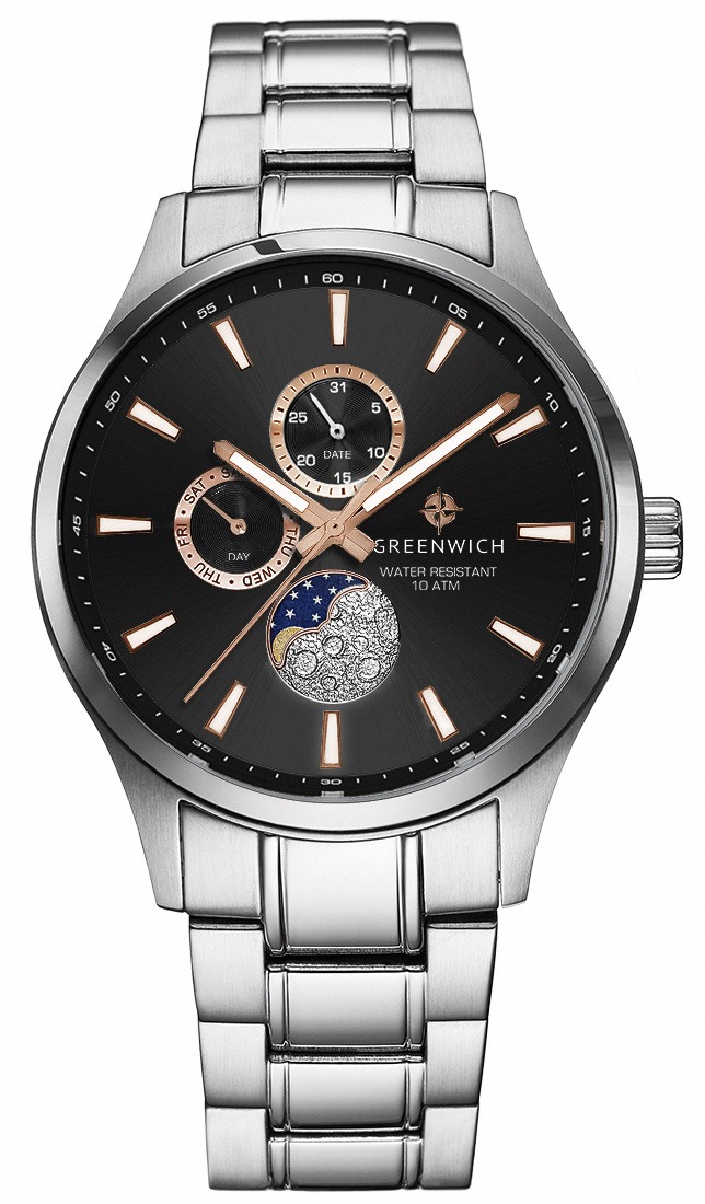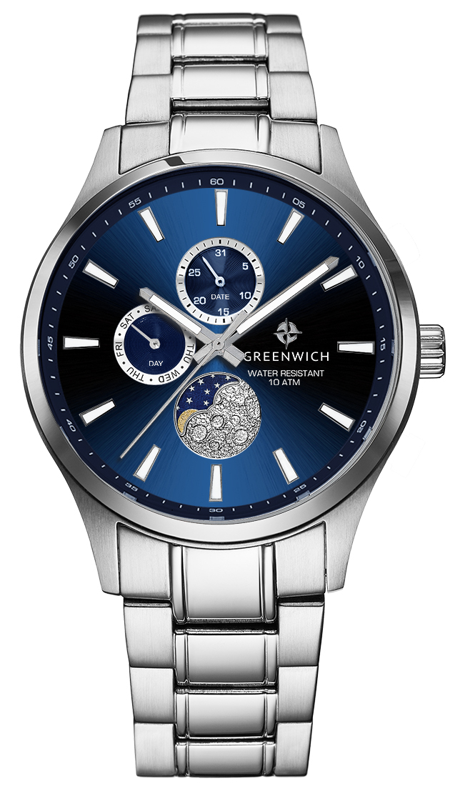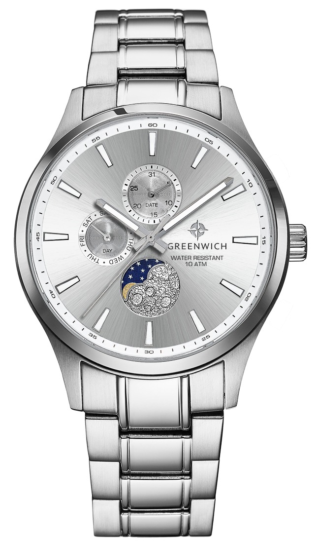Элегантные наручные часы Greenwich Moon Walker представляют собой гармоничное сочетание спортивного дизайна и классических линий. Корпус часов выполнен из высококачественной нержавеющей стали, что обеспечивает долговечность и надёжность конструкции. Кварцевый механизм обеспечивает точный ход, отображая не только время, но и дату, день недели, а также фазы луны благодаря специальному индикатору в позиции «6 часов».