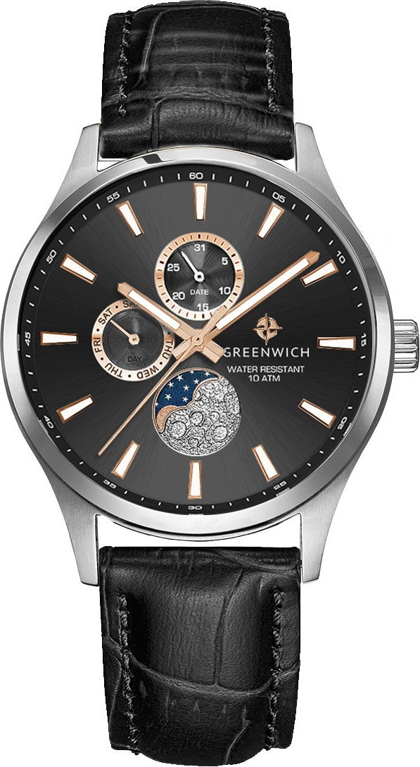 Элегантные наручные часы Greenwich Moon Walker представляют собой гармоничное сочетание спортивного дизайна и классических линий. Корпус часов выполнен из высококачественной нержавеющей стали, что обеспечивает долговечность и надёжность конструкции. Кварцевый механизм обеспечивает точный ход, отображая не только время, но и дату, день недели, а также фазы луны благодаря специальному индикатору в позиции «6 часов».