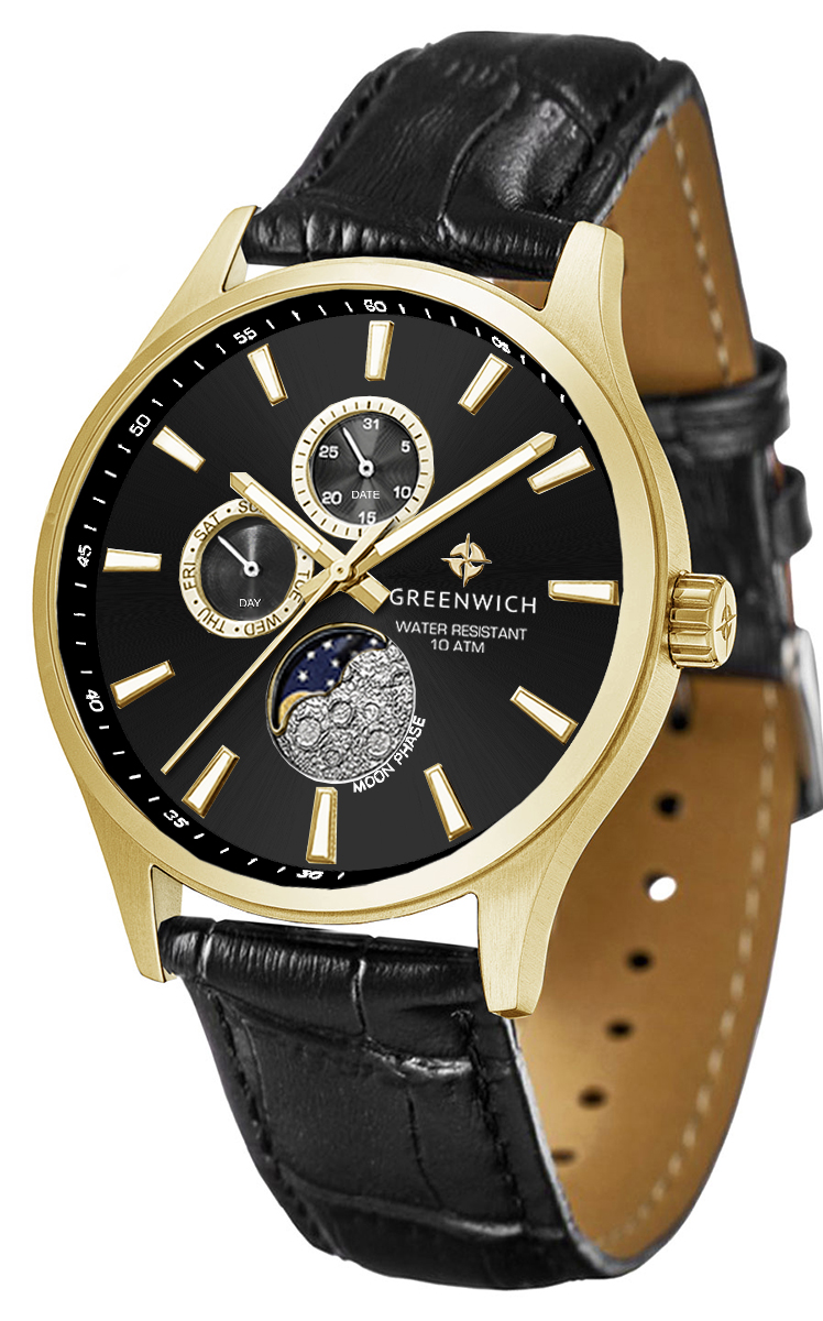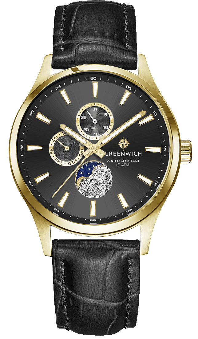 Элегантные наручные часы Greenwich Moon Walker представляют собой гармоничное сочетание спортивного дизайна и классических линий. Корпус часов выполнен из высококачественной нержавеющей стали, что обеспечивает долговечность и надёжность конструкции. Кварцевый механизм обеспечивает точный ход, отображая не только время, но и дату, день недели, а также фазы луны благодаря специальному индикатору в позиции «6 часов».