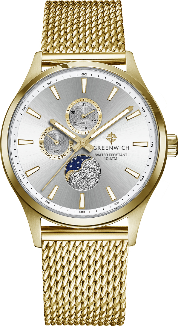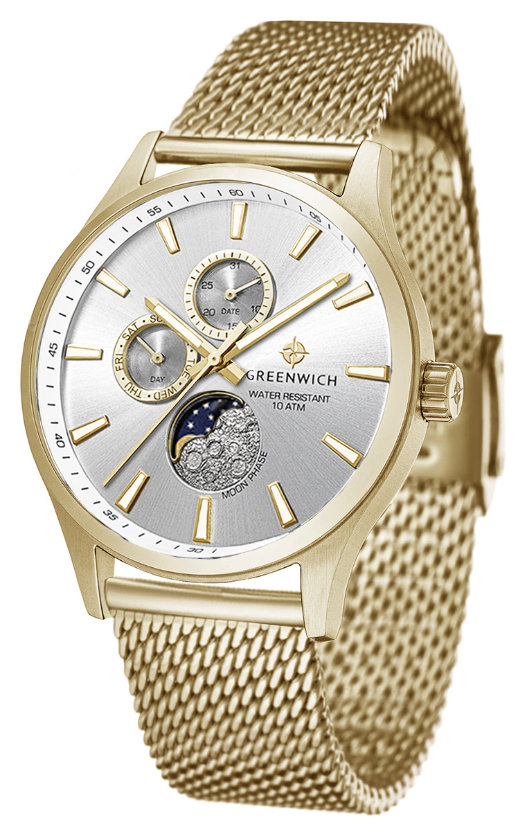 Элегантные наручные часы Greenwich Moon Walker представляют собой гармоничное сочетание спортивного дизайна и классических линий. Корпус часов выполнен из высококачественной нержавеющей стали, что обеспечивает долговечность и надёжность конструкции. Кварцевый механизм обеспечивает точный ход, отображая не только время, но и дату, день недели, а также фазы луны благодаря специальному индикатору в позиции «6 часов».