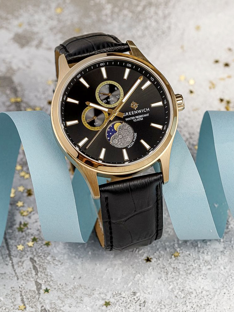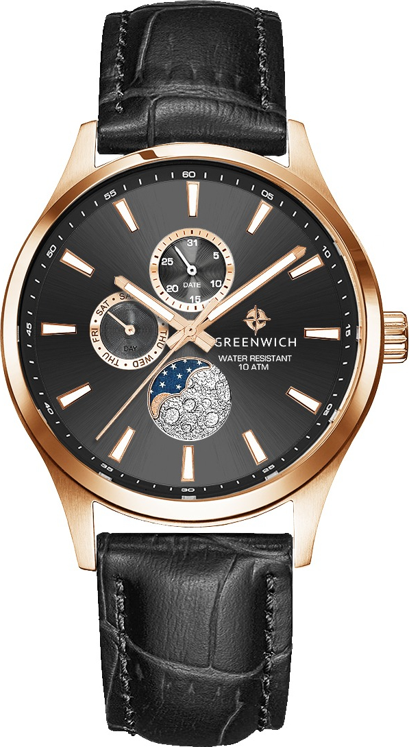 Элегантные наручные часы Greenwich Moon Walker представляют собой гармоничное сочетание спортивного дизайна и классических линий. Корпус часов выполнен из высококачественной нержавеющей стали, что обеспечивает долговечность и надёжность конструкции. Кварцевый механизм обеспечивает точный ход, отображая не только время, но и дату, день недели, а также фазы луны благодаря специальному индикатору в позиции «6 часов».