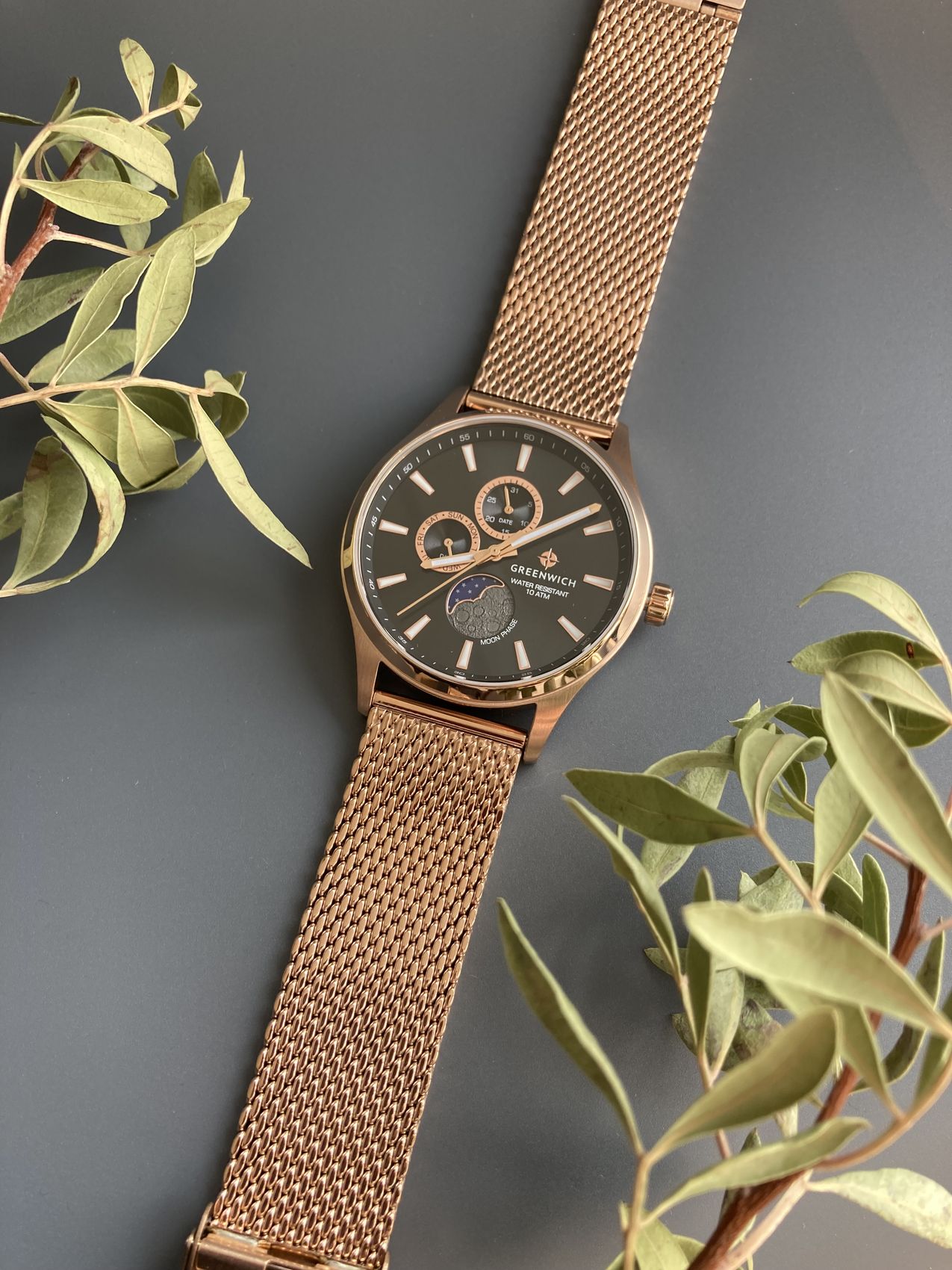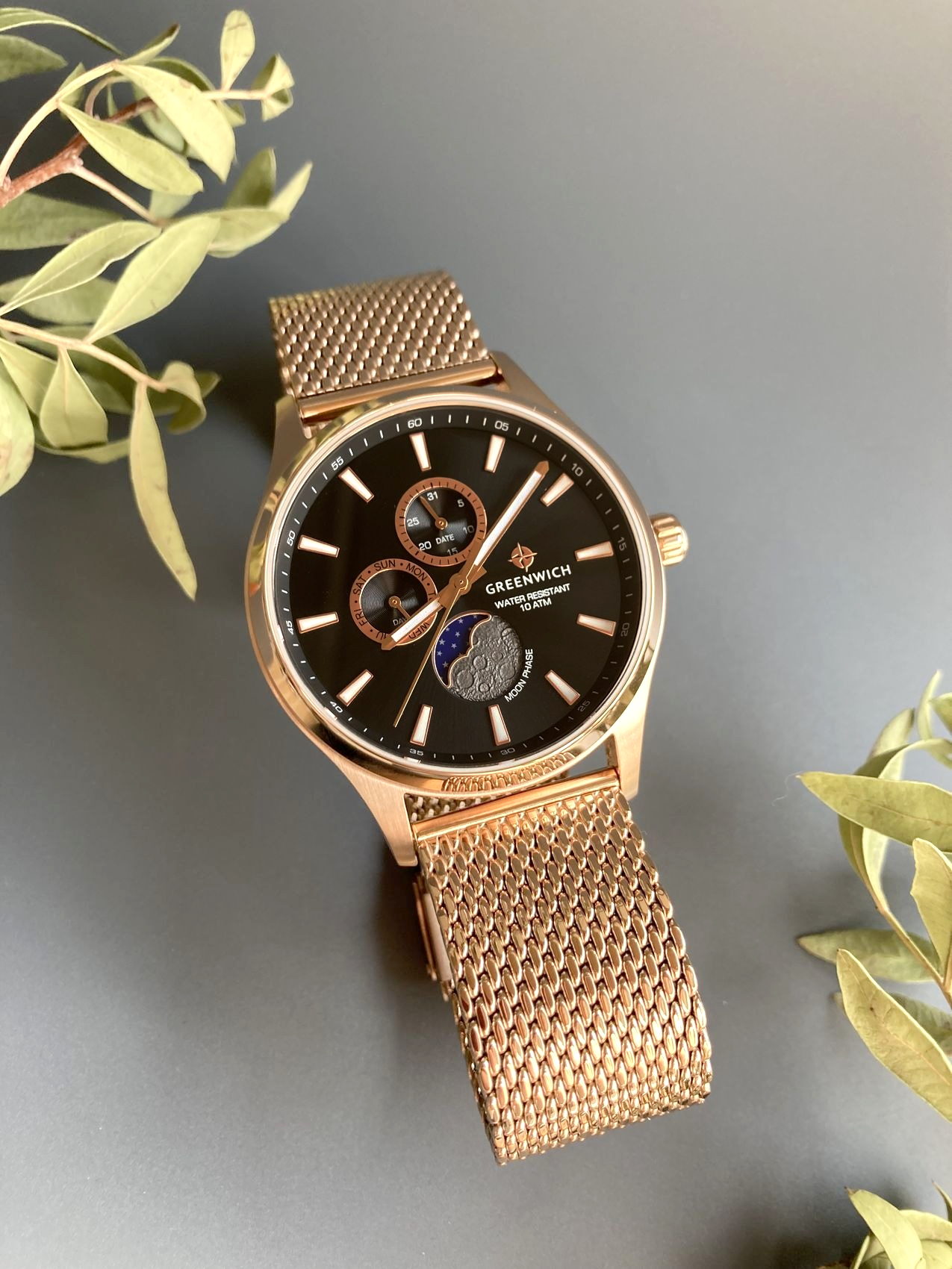 Элегантные наручные часы Greenwich Moon Walker представляют собой гармоничное сочетание спортивного дизайна и классических линий. Корпус часов выполнен из высококачественной нержавеющей стали, что обеспечивает долговечность и надёжность конструкции. Кварцевый механизм обеспечивает точный ход, отображая не только время, но и дату, день недели, а также фазы луны благодаря специальному индикатору в позиции «6 часов».