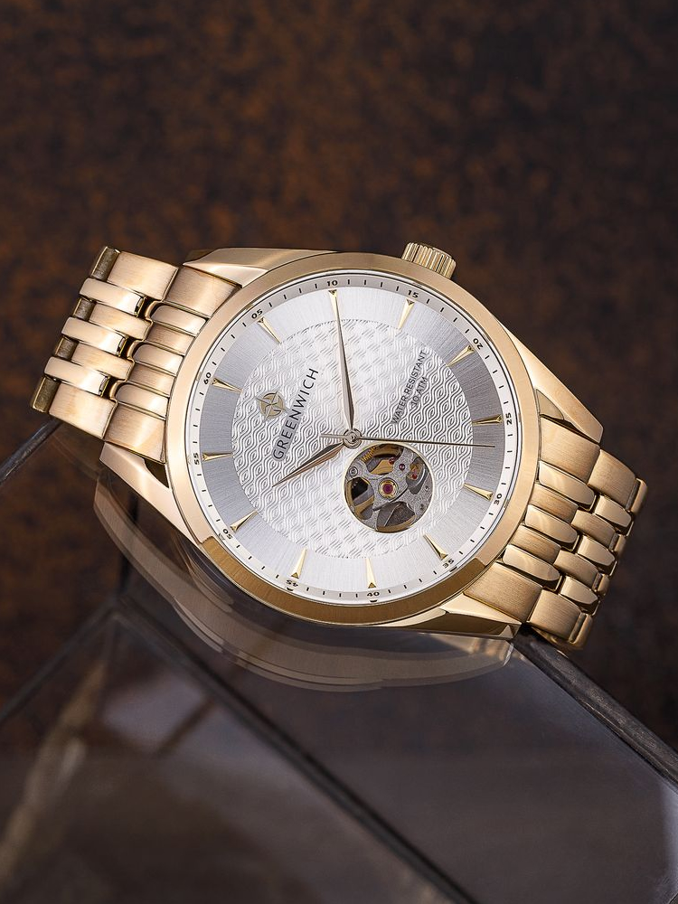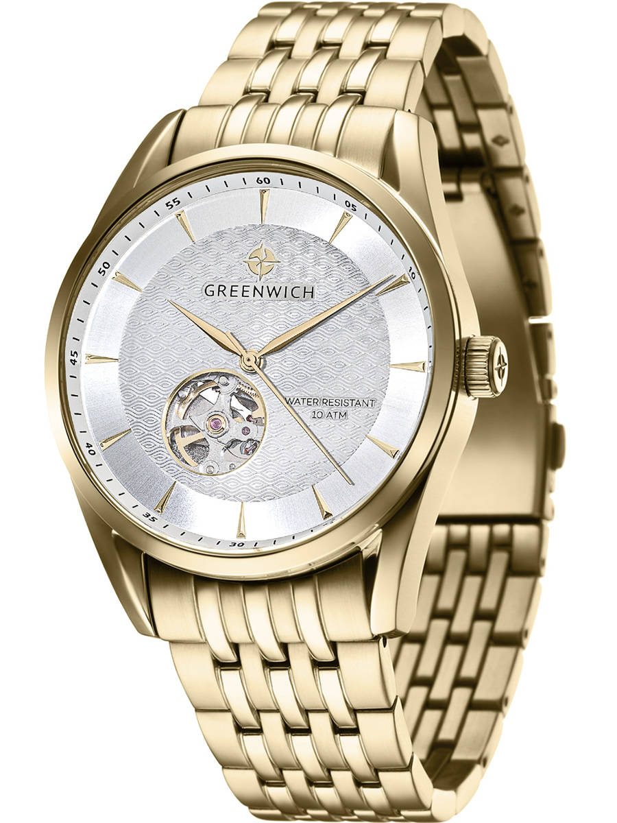 Мужские механические наручные часы Greenwich коллекции Good Luck Deep представляют собой изысканное сочетание классического дизайна и современных технологий. Корпус часов, выполненный из высококачественной нержавеющей стали, отличается безупречной полировкой, которая придает изделию роскошный блеск и обеспечивает долговечность. Циферблат часов привлекает внимание своей лаконичностью и четкостью исполнения. Минеральное стекло, устойчивое к появлению царапин, надежно защищает циферблат от внешних воздействий. Присутствует апертура открытого баланса. Браслет, изготовленный из нержавеющей стали, идеально дополняет общий дизайн и обеспечивает комфортное ношение на запястье. Надежная застежка гарантирует, что часы останутся на руке в любой ситуации. Водозащита позволяет не снимать часы во время мытья рук и в дождливую погоду, с часами так же можно плавать, что делает их практичным аксессуаром для повседневного использования. Прозрачная завинчивающаяся задняя крышка открывает вид на слаженную работу японского механизма с автоподзаводом, механизм часов отличается высокой точностью хода и надежностью. Эти часы станут отличным выбором для тех, кто ценит классический стиль и качество исполнения. Они прекрасно дополнят как деловой костюм, так и повседневный гардероб, подчеркивая хороший вкус и статус своего владельца. Гарантия 2 года.