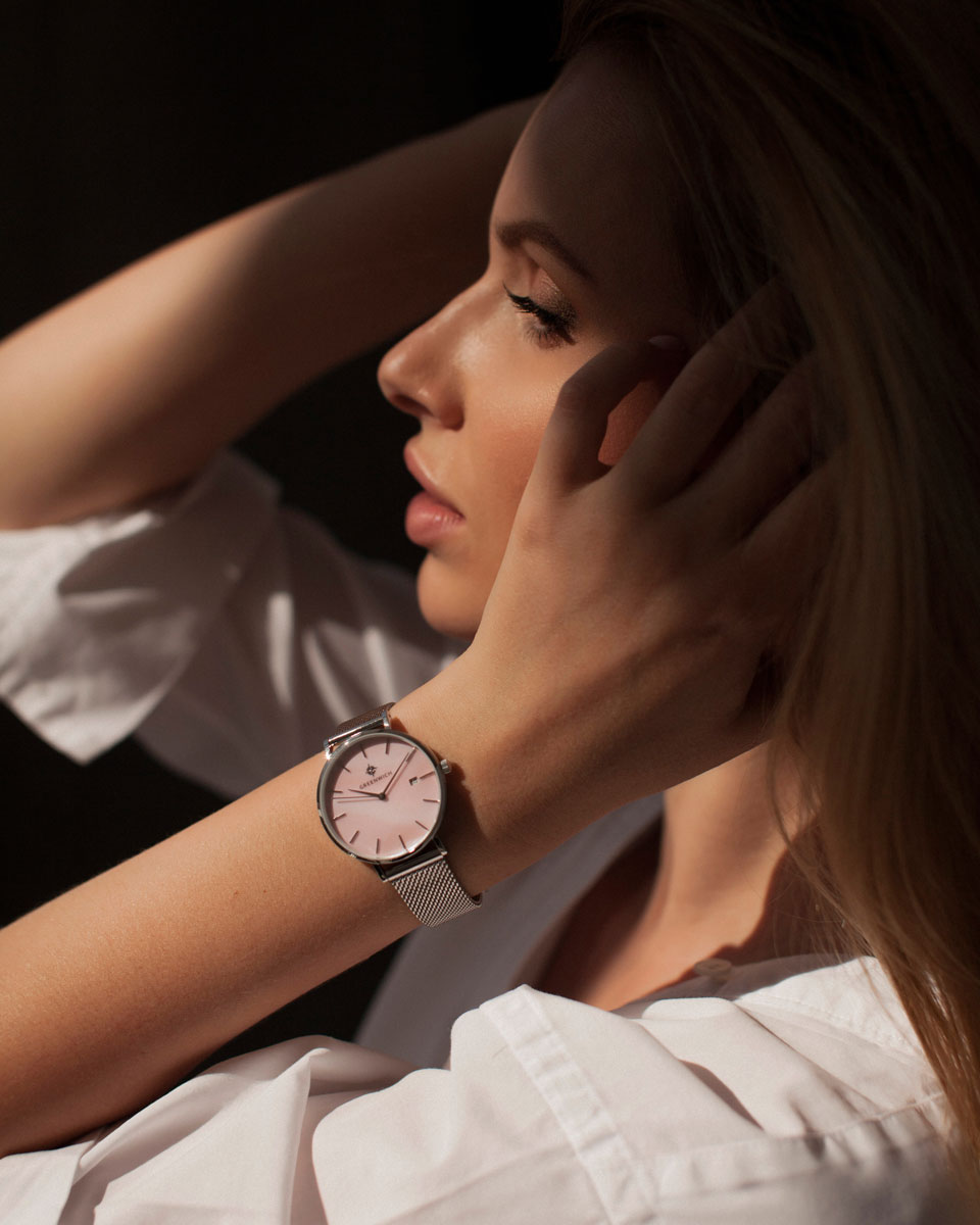 Корпус часов выполнен из высококачественной нержавеющей стали, что обеспечивает долговечность и устойчивость к повседневным воздействиям. Особого внимания заслуживает уникальный перламутровый циферблат, который делает каждую модель неповторимой благодаря естественной текстуре материала.