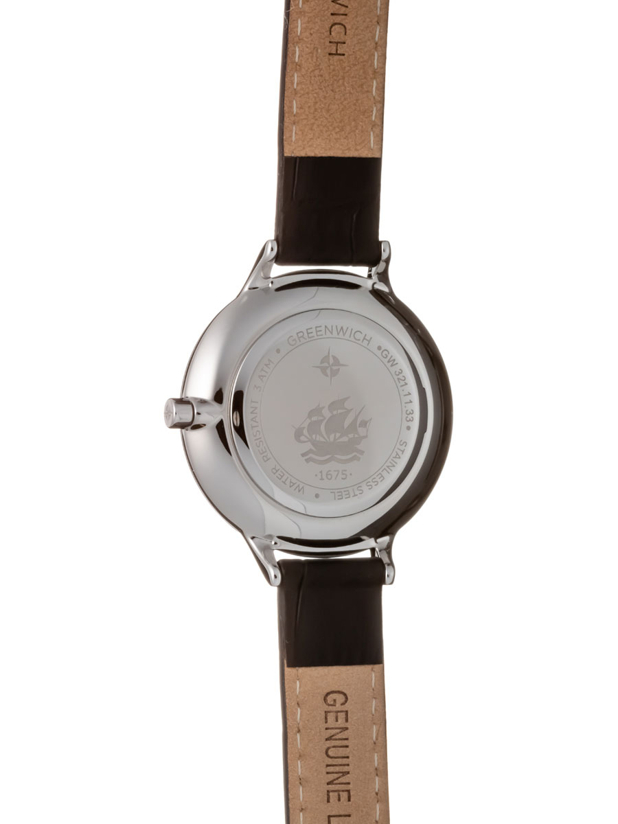 Особую символичность модели придает эмблема в виде розы ветров, расположенная на циферблате и заводной головке. Этот древний символ удачи и новых открытий является визитной карточкой бренда Greenwich. Задняя крышка часов украшена изображением корабля – еще одного узнаваемого элемента фирменного стиля.