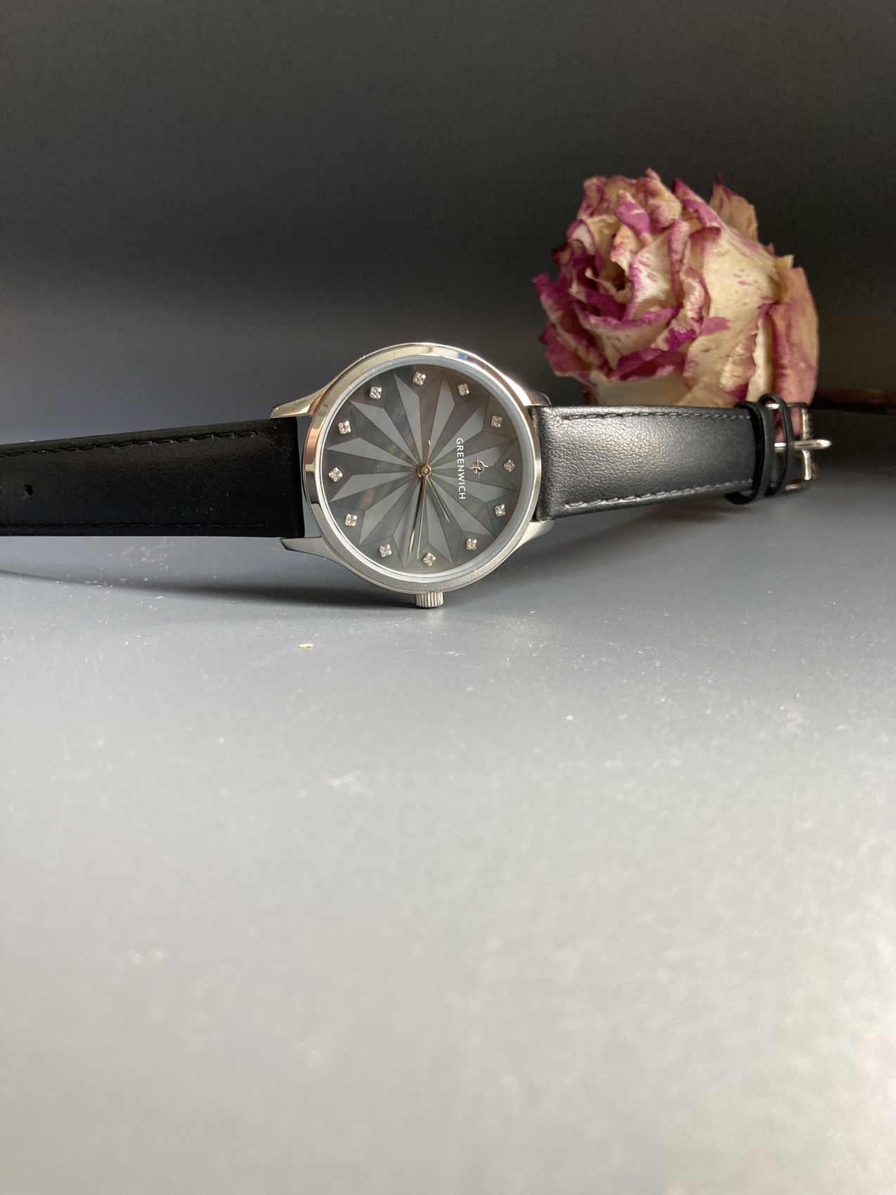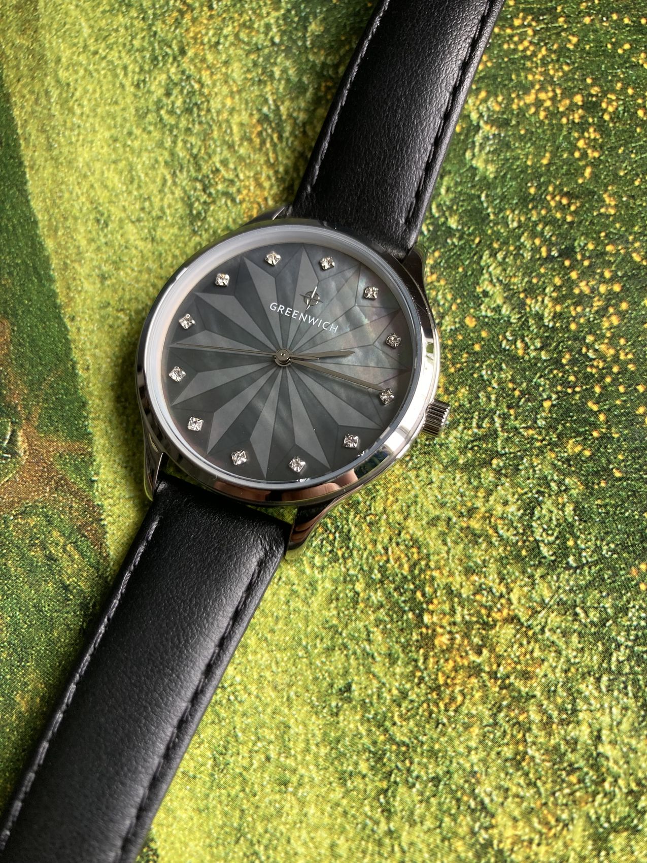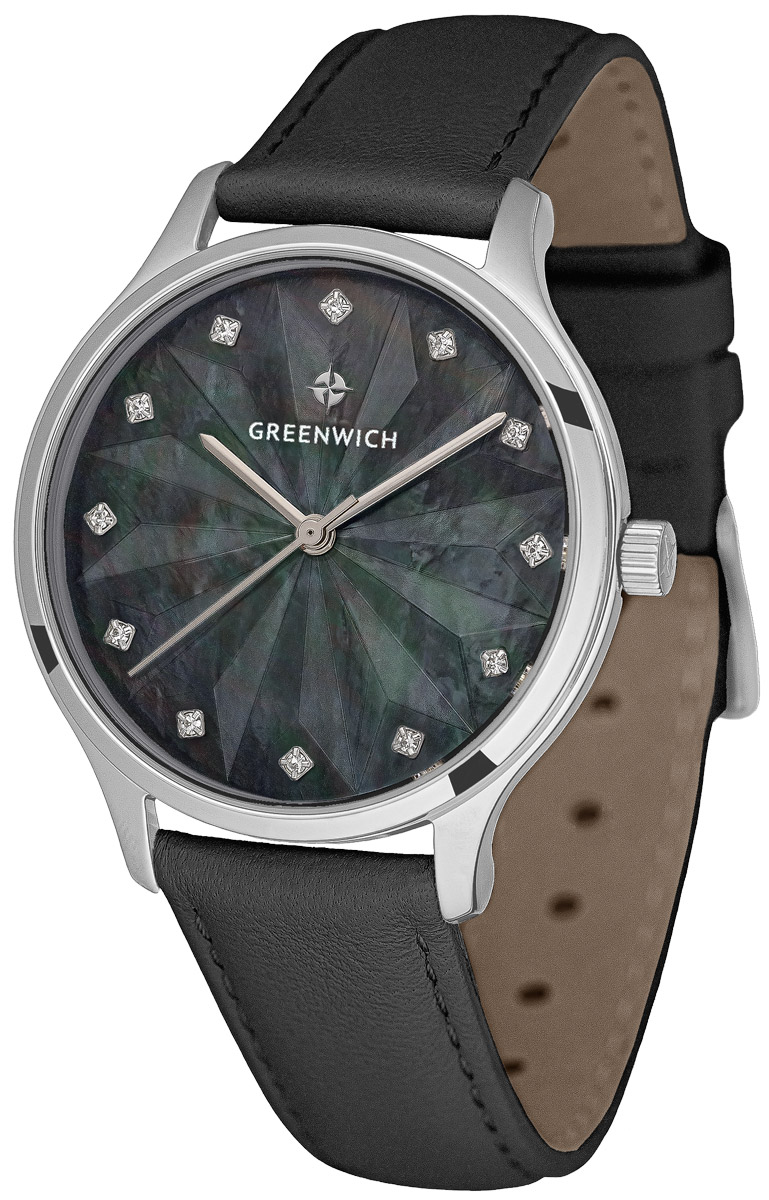 Минеральное стекло устойчиво к появлению царапин и надежно защищает циферблат. Модель комплектуется элегантным ремешком из натуральной кожи черного цвета, который дополнен надежной застежкой-пряжкой с фирменным логотипом Greenwich.