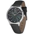 Корпус часов выполнен из высококачественной гипоаллергенной нержавеющей стали 316L, имеет классический круглый дизайн и компактный размер 34 мм в диаметре. Особое внимание привлекает уникальный циферблат из натурального черного перламутра, украшенный изящной гравировкой в виде звездного неба и декорированный сверкающими фианитами, надежно закрепленными в кастах.