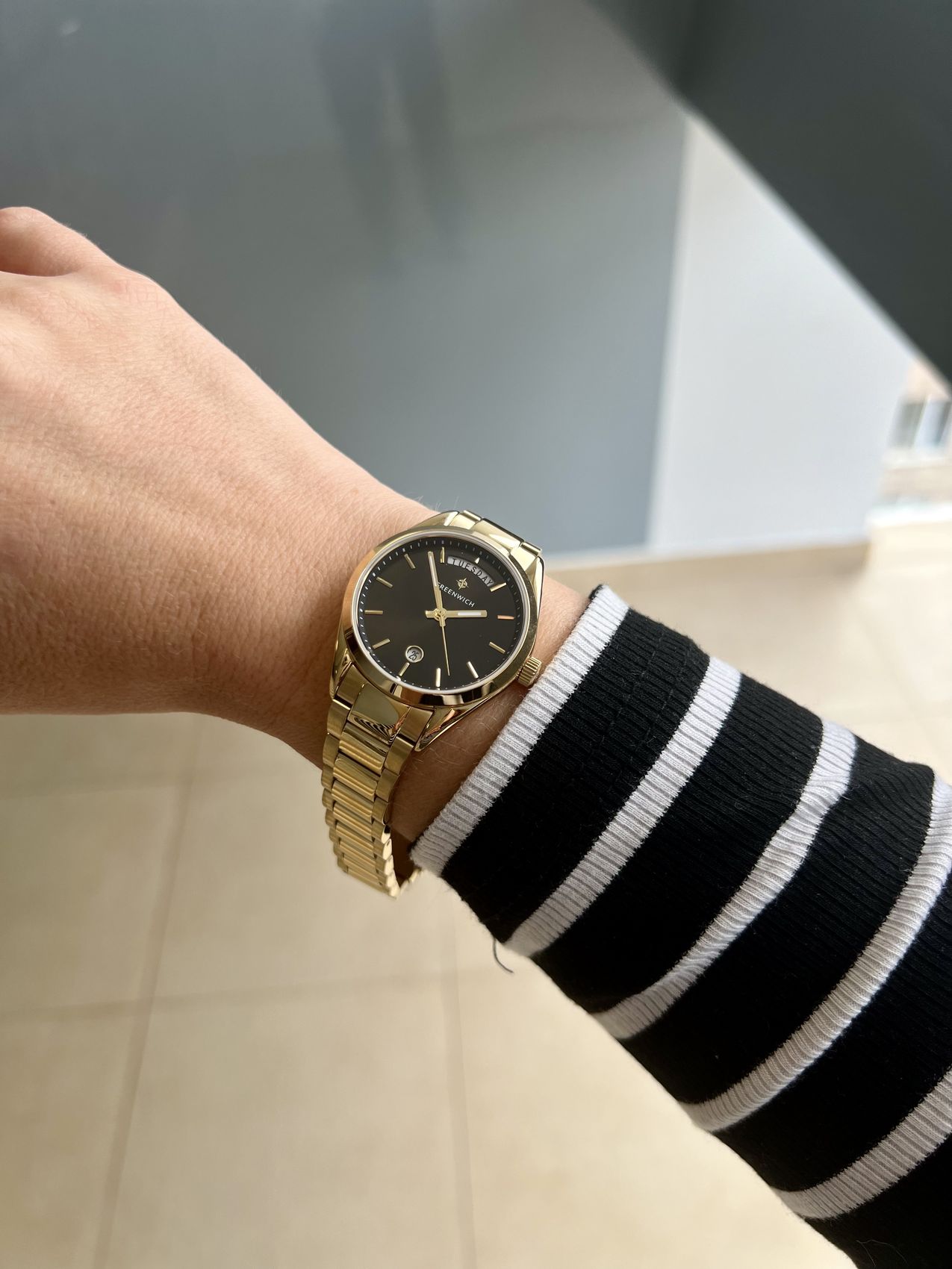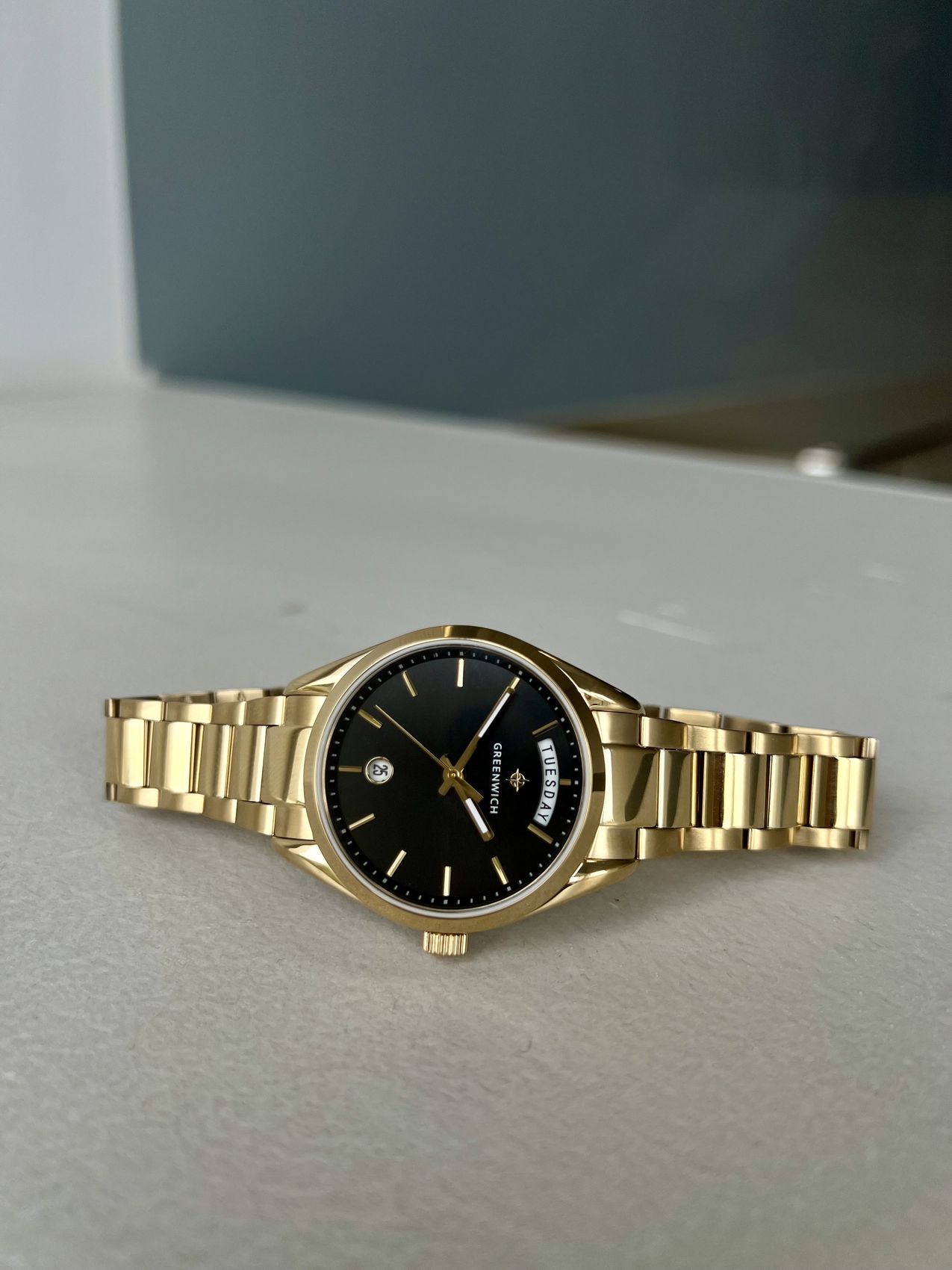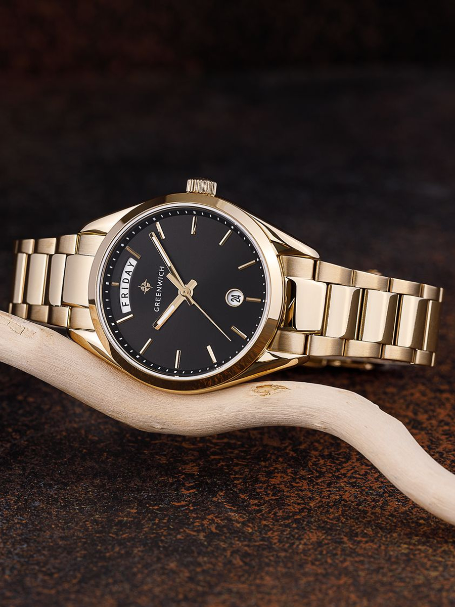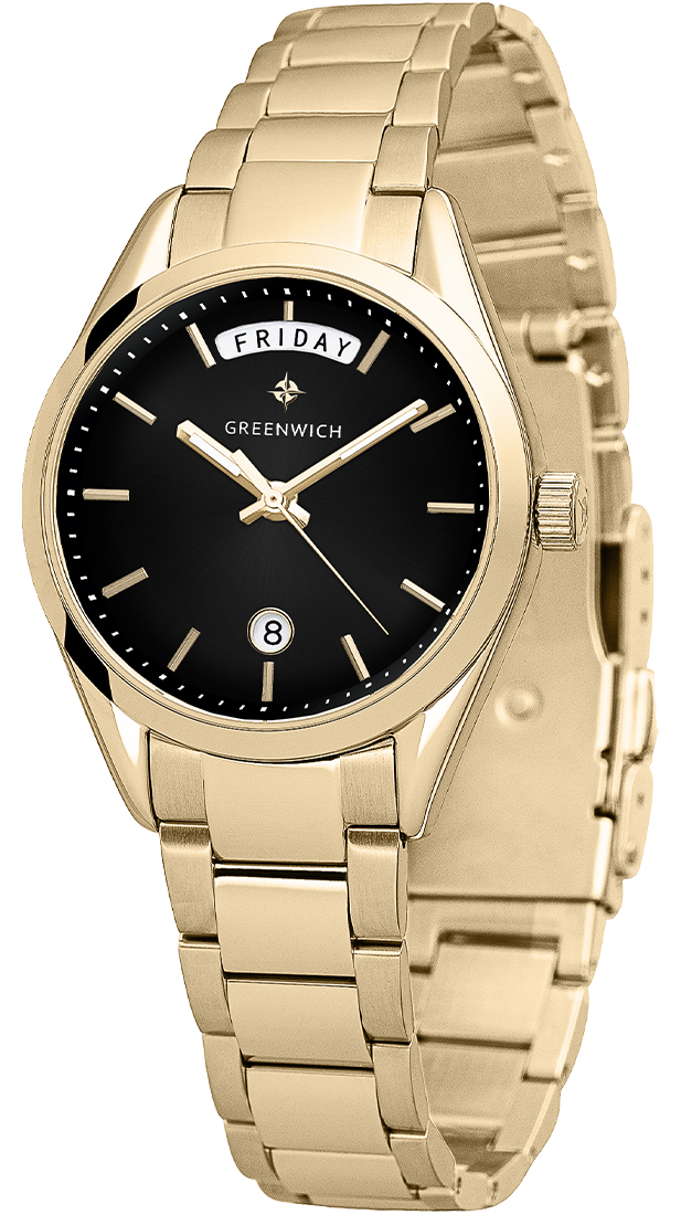 Элегантные наручные часы Greenwich из коллекции Astrea представляют собой изысканную женскую модель с классическим дизайном. Корпус часов диаметром 34 мм выполнен из высококачественной нержавеющей стали с премиальным PVD-покрытием золотистого цвета, которое не только придает изделию роскошный внешний вид, но и обеспечивает дополнительную защиту от внешних воздействий.