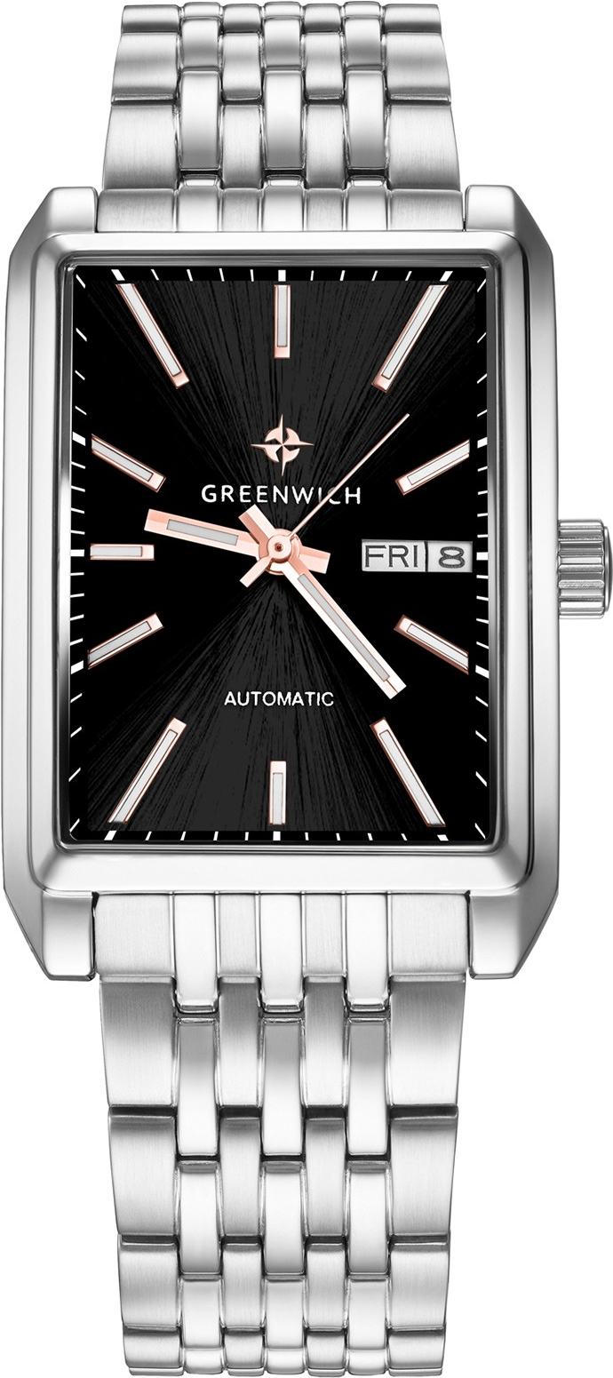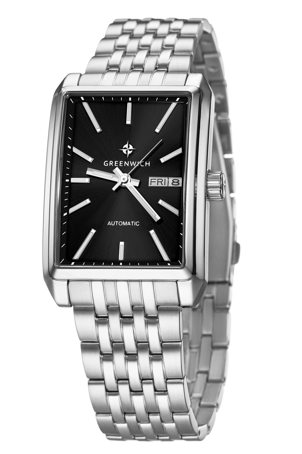 Наручные часы Greenwich Caravel - это мужские механические часы с автоподзаводом, представляющие собой современное прочтение классики. Модель выполнена в элегантном прямоугольном корпусе со скошенными углами размером 33 × 46 мм; корпус и браслет изготовлены из гипоаллергенной нержавеющей стали 316L, что обеспечивает долговечность и комфорт при носке. Чёрный циферблат хорошо читается в любых условиях: часовая и минутная стрелки, а также накладные риски покрыты люминесцентным составом SuperLuminova, который светится в темноте. За движение стрелок, а также дисков даты и дня недели отвечает японский механизм Miyota с функцией автоподзавода — его работу можно наблюдать через прозрачное окошко на задней крышке часов. На браслете установлена надёжная и удобная застёжка‑клипса, а чередование зеркальной полировки и матирования на звеньях подчёркивает структуру стального браслета. Часы обладают водозащитой 5 ATM (50 метров), что защищает их от случайных брызг. Минеральное стекло надёжно защищает циферблат. В целом, Greenwich Caravel — это универсальный и стильный аксессуар, не требующий замены элемента питания, который подходит для ежедневного использования: ротор заводит пружину механизма от обычных движений руки, без необходимости завода с помощью заводной головки. Гарантия 2 года.