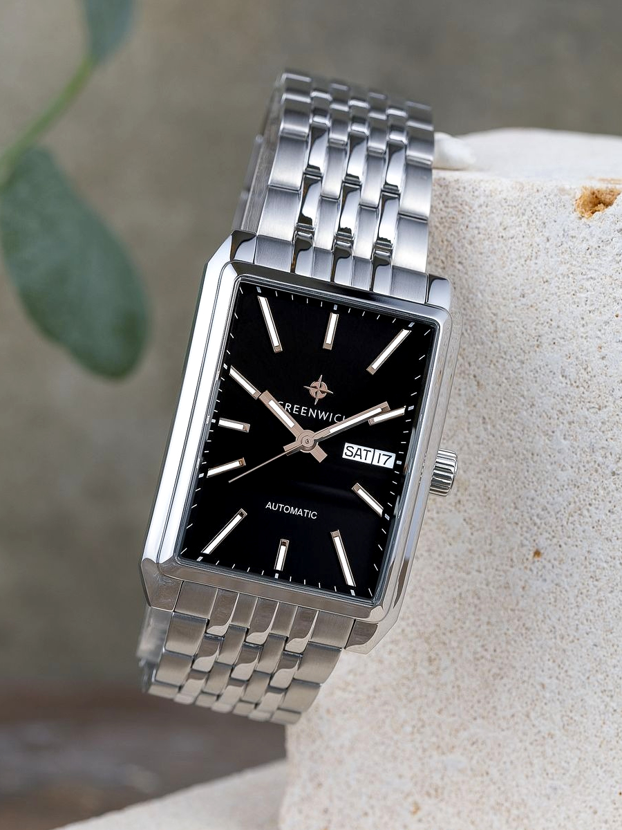 Наручные часы Greenwich Caravel - это мужские механические часы с автоподзаводом, представляющие собой современное прочтение классики. Модель выполнена в элегантном прямоугольном корпусе со скошенными углами размером 33???46?мм; корпус и браслет изготовлены из гипоаллергенной нержавеющей стали 316L, что обеспечивает долговечность и комфорт при носке. Чёрный циферблат хорошо читается в любых условиях: часовая и минутная стрелки, а также накладные риски покрыты люминесцентным составом SuperLuminova, который светится в темноте. За движение стрелок, а также дисков даты и дня недели отвечает японский механизм Miyota с функцией автоподзавода — его работу можно наблюдать через прозрачное окошко на задней крышке часов. На браслете установлена надёжная и удобная застёжка?клипса, а чередование зеркальной полировки и матирования на звеньях подчёркивает структуру стального браслета. Часы обладают водозащитой 5?ATM (50?метров), что защищает их от случайных брызг. Минеральное стекло надёжно защищает циферблат. В целом, Greenwich Caravel — это универсальный и стильный аксессуар, не требующий замены элемента питания, который подходит для ежедневного использования: ротор заводит пружину механизма от обычных движений руки, без необходимости завода с помощью заводной головки. Гарантия 2 года.