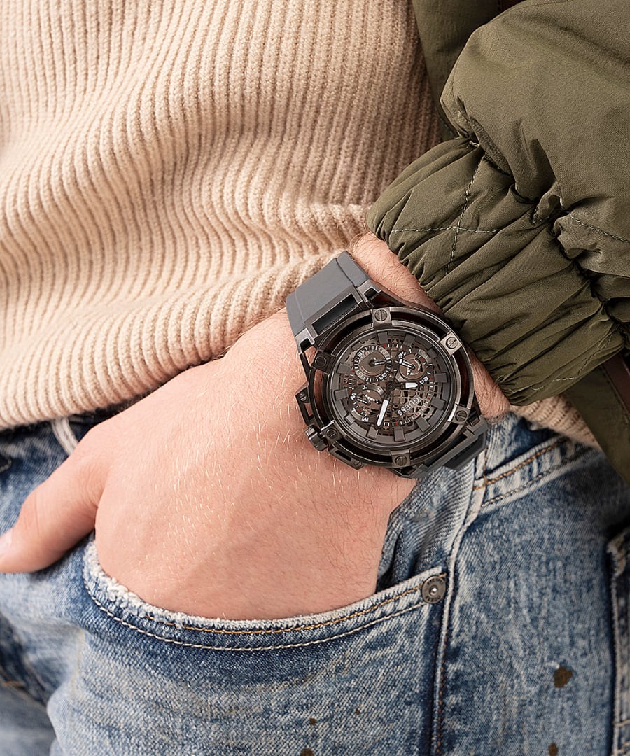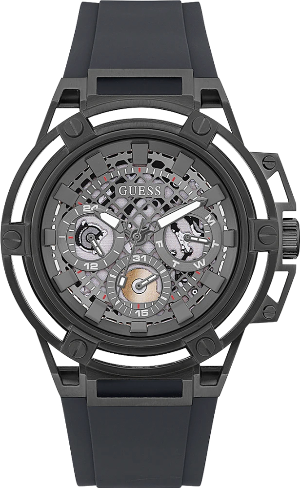 Мужские наручные часы со скелетонизированным циферблатом. На отдельных малых циферблатах отображаются дата, день недели и текущее время в 24-х часовом формате. Заводная головка с защитой. Ремешок с классической застежкой. Гарантия 2 года.
