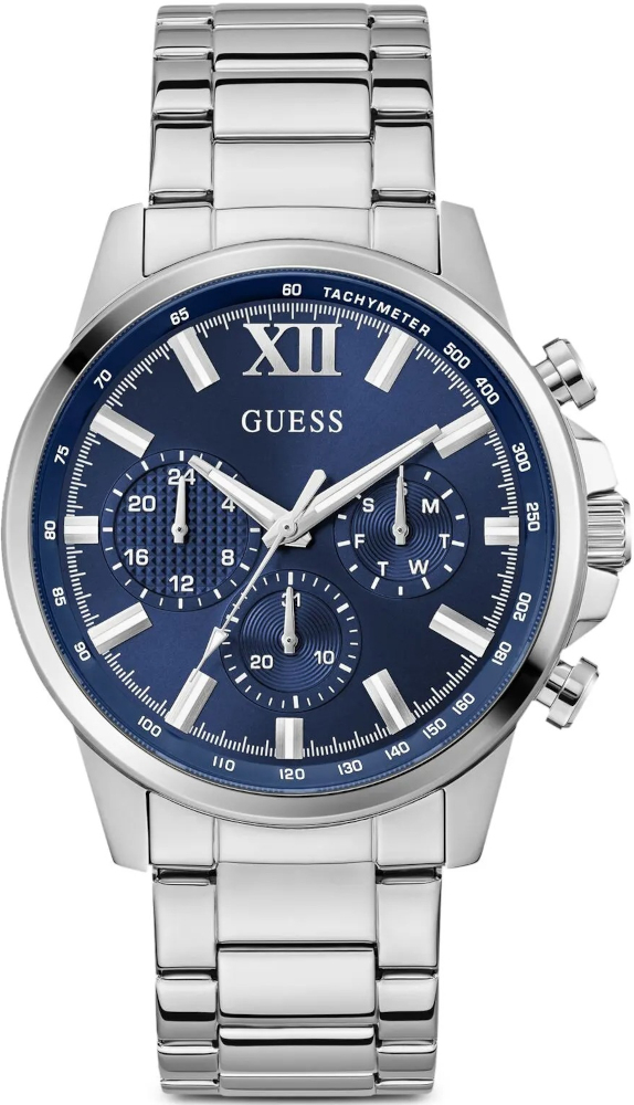 Практичные мужские часы Guess с дополнительным отображением на малых циферблатах даты, дня недели и текущего времени в 24-х часовом формате. Присутствует разметка тахиметрической шкалы. Заводная головка с защитой. Браслет с раскладывающейся застежкой. Гарантия 2 года.