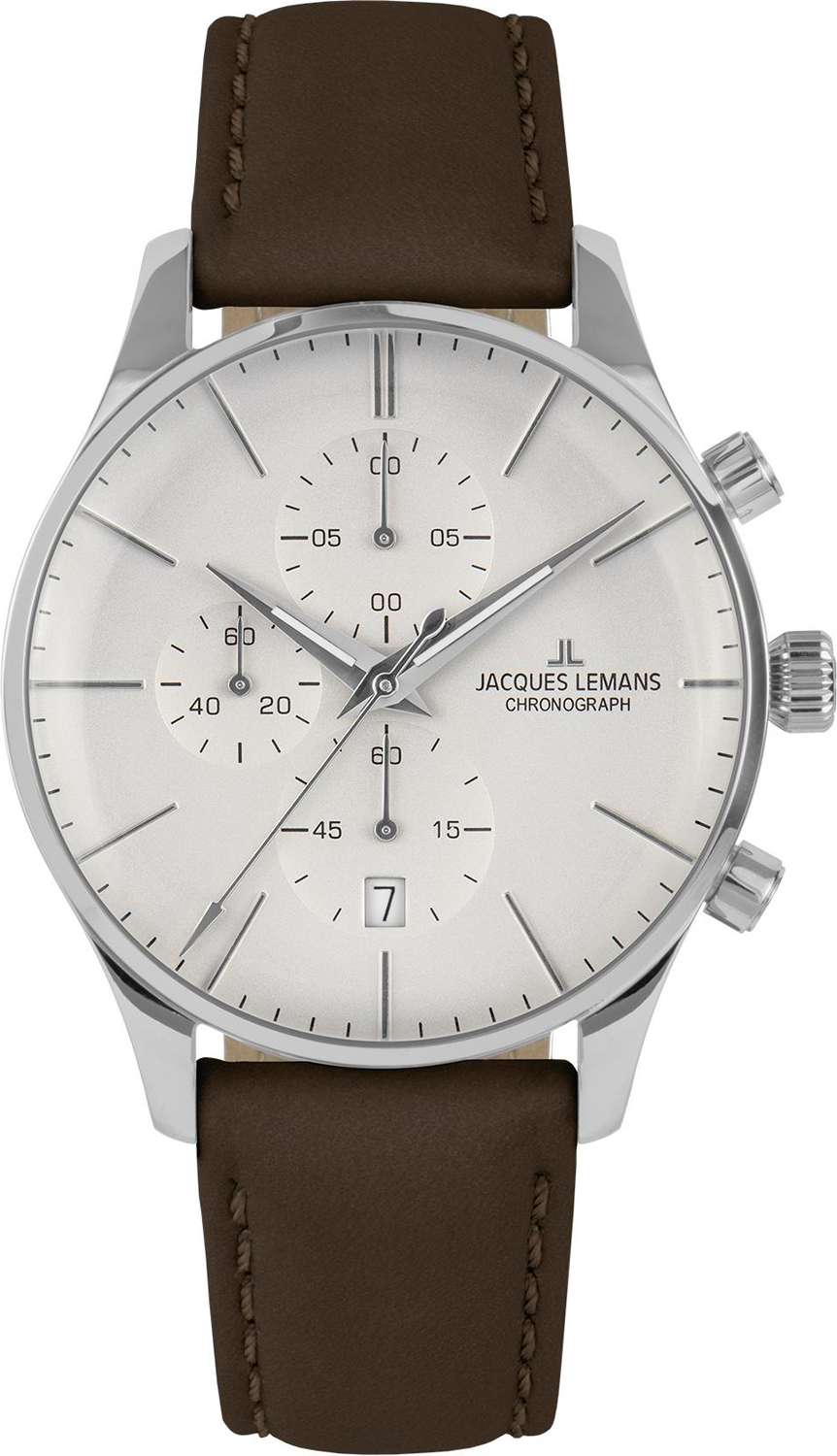 Мужские наручные часы-хронограф Jacques Lemans London с секундомером. Циферблат закрывает минеральное стекло Crystex повышенной прочности, стекло имеет сферическую форму. Присутствует окошко даты. Ремешок с классической застежкой. Гарантия 2 года.