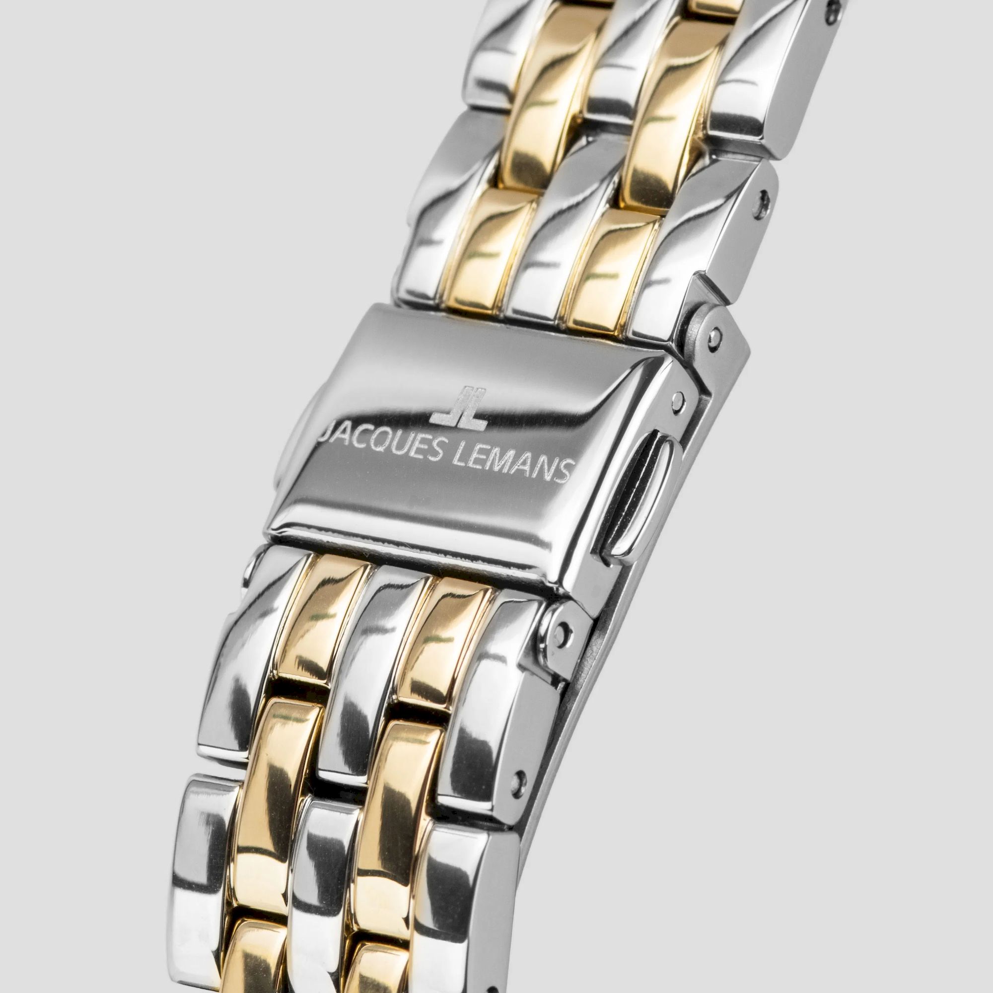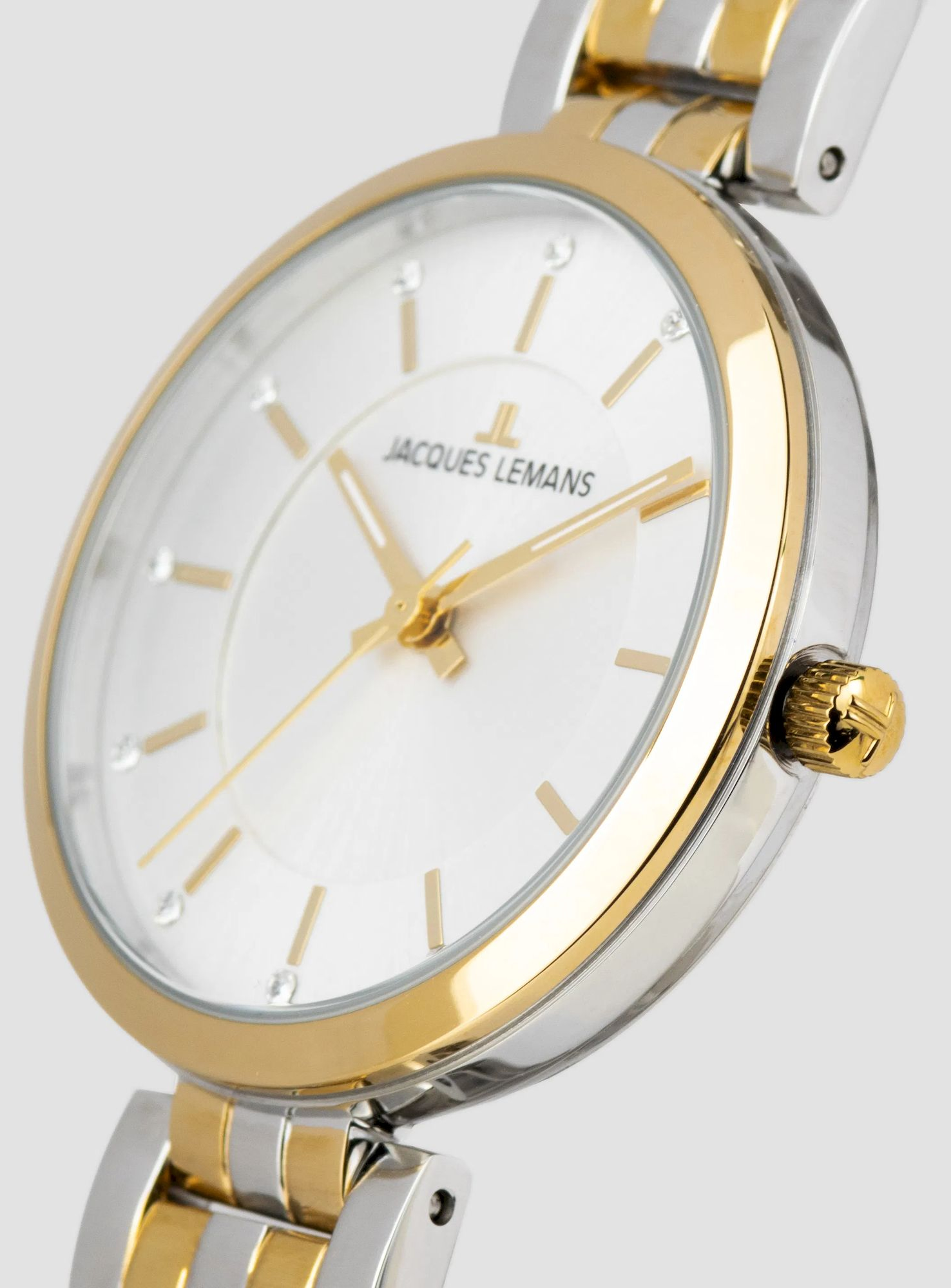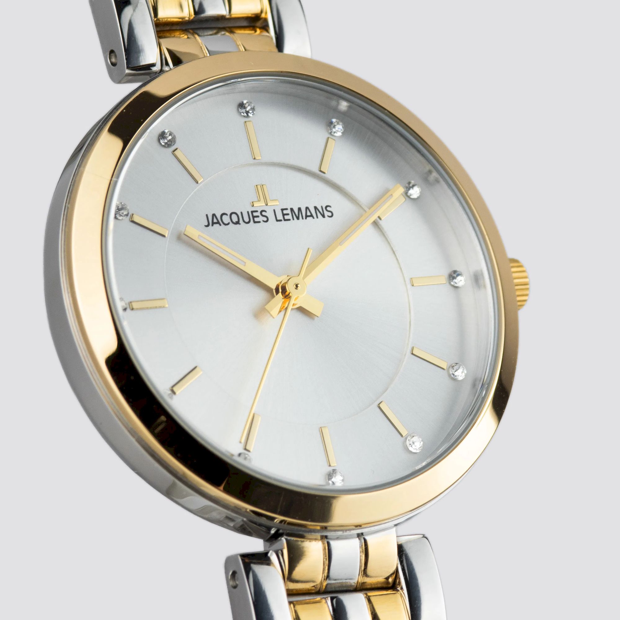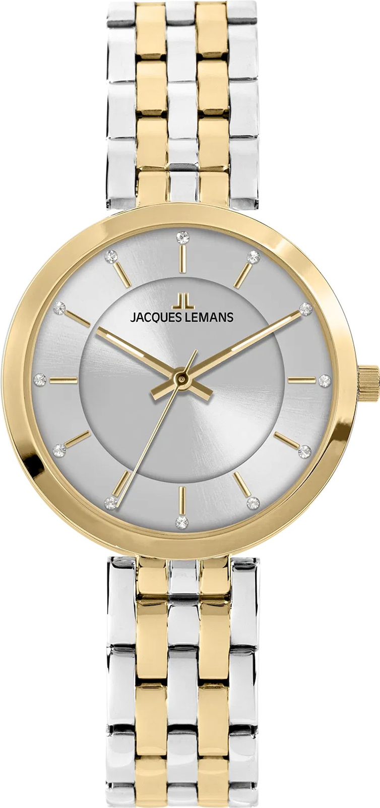 Элегантные женские часы Jacques Lemans , коллекция Classic Milano. Циферблат украшен кристаллами Swarovski в местах часовых меток. Циферблат закрывает фирменное закаленное минеральное стекло Crystex. Точность хода обеспечивает японский кварцевый механизм. Браслет с раскладывающейся застежкой. Гарантия 2 года.