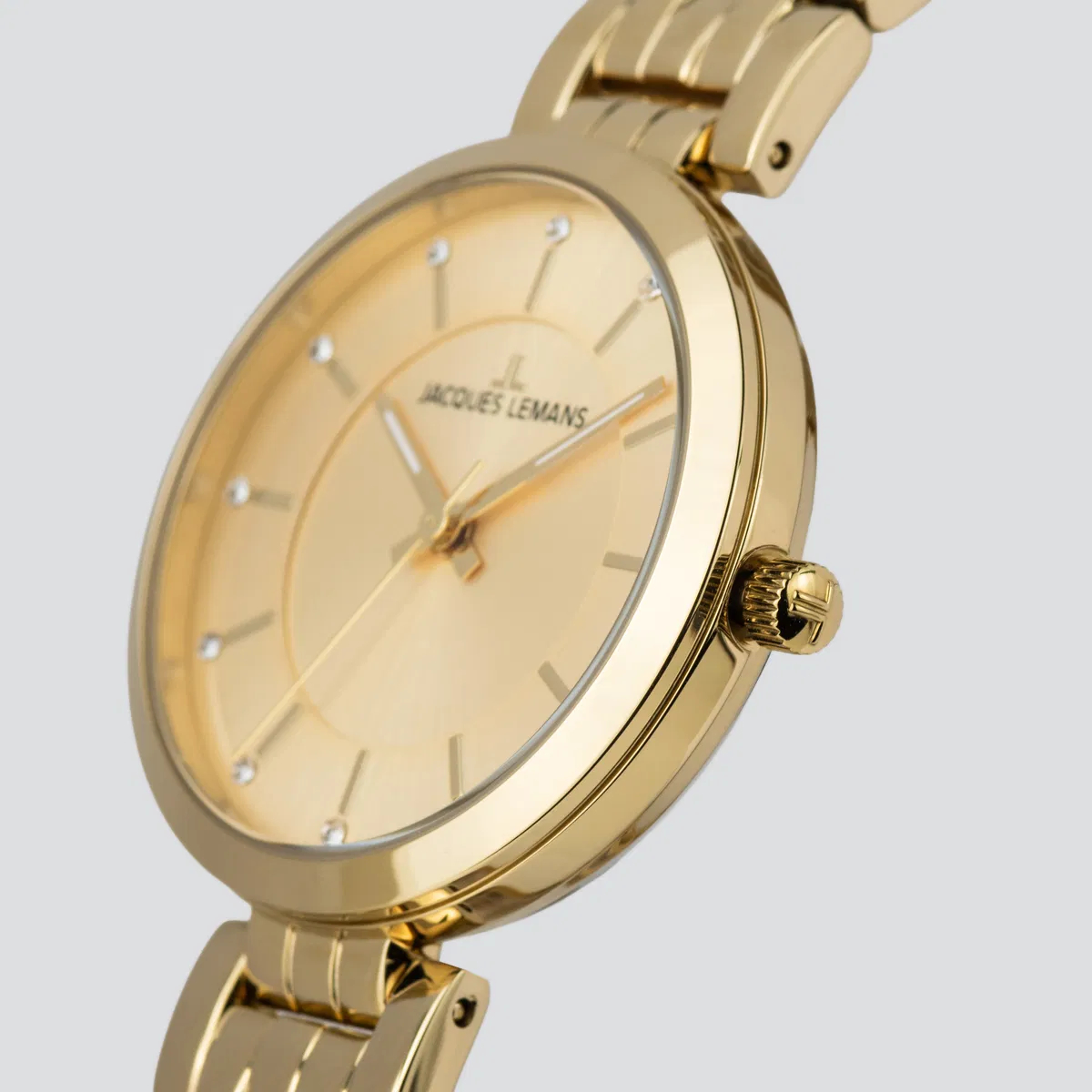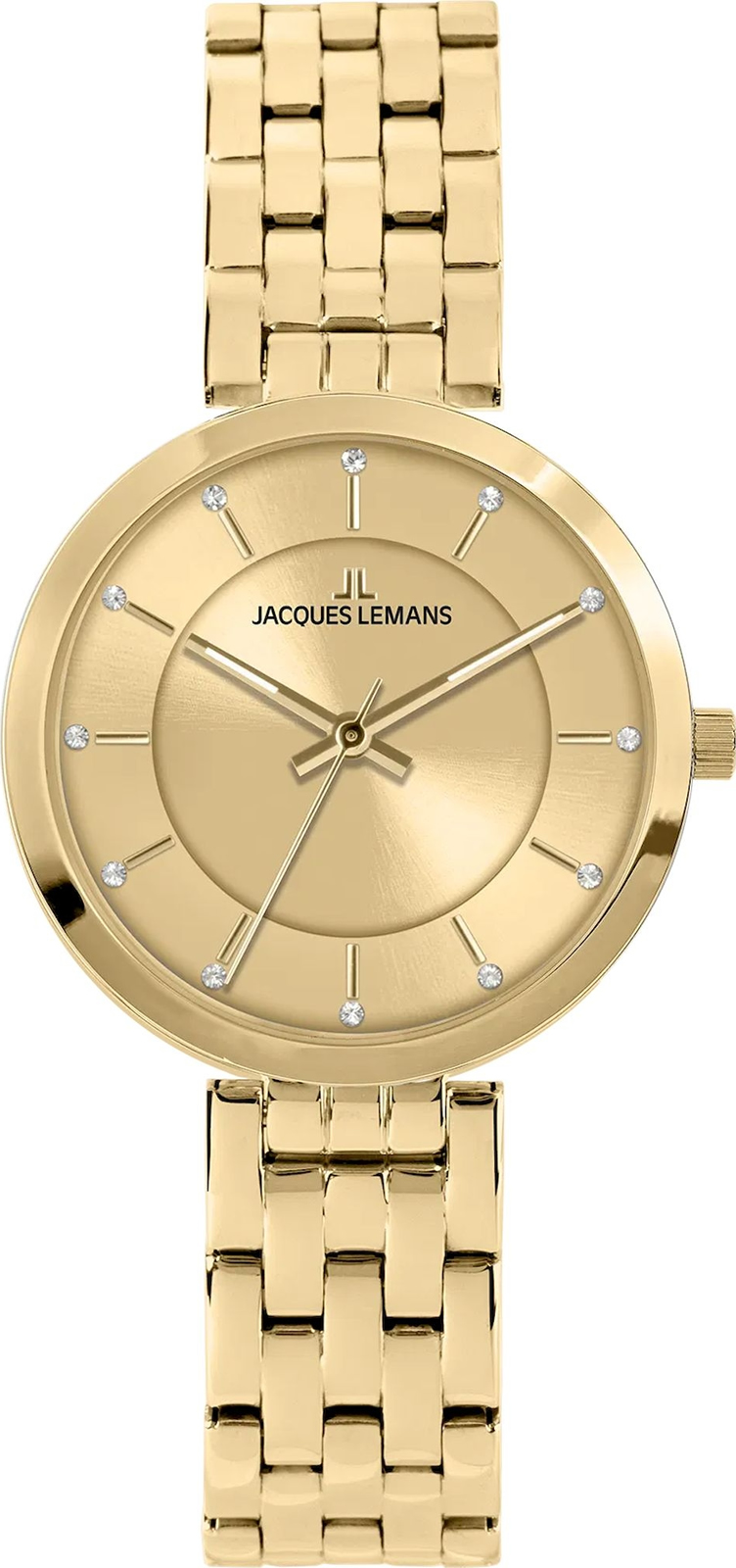 Элегантные женские часы Jacques Lemans , коллекция Classic Milano. Циферблат украшен кристаллами Swarovski в местах часовых меток. Циферблат закрывает фирменное закаленное минеральное стекло Crystex. Точность хода обеспечивает японский кварцевый механизм. Браслет с раскладывающейся застежкой. Гарантия 2 года.