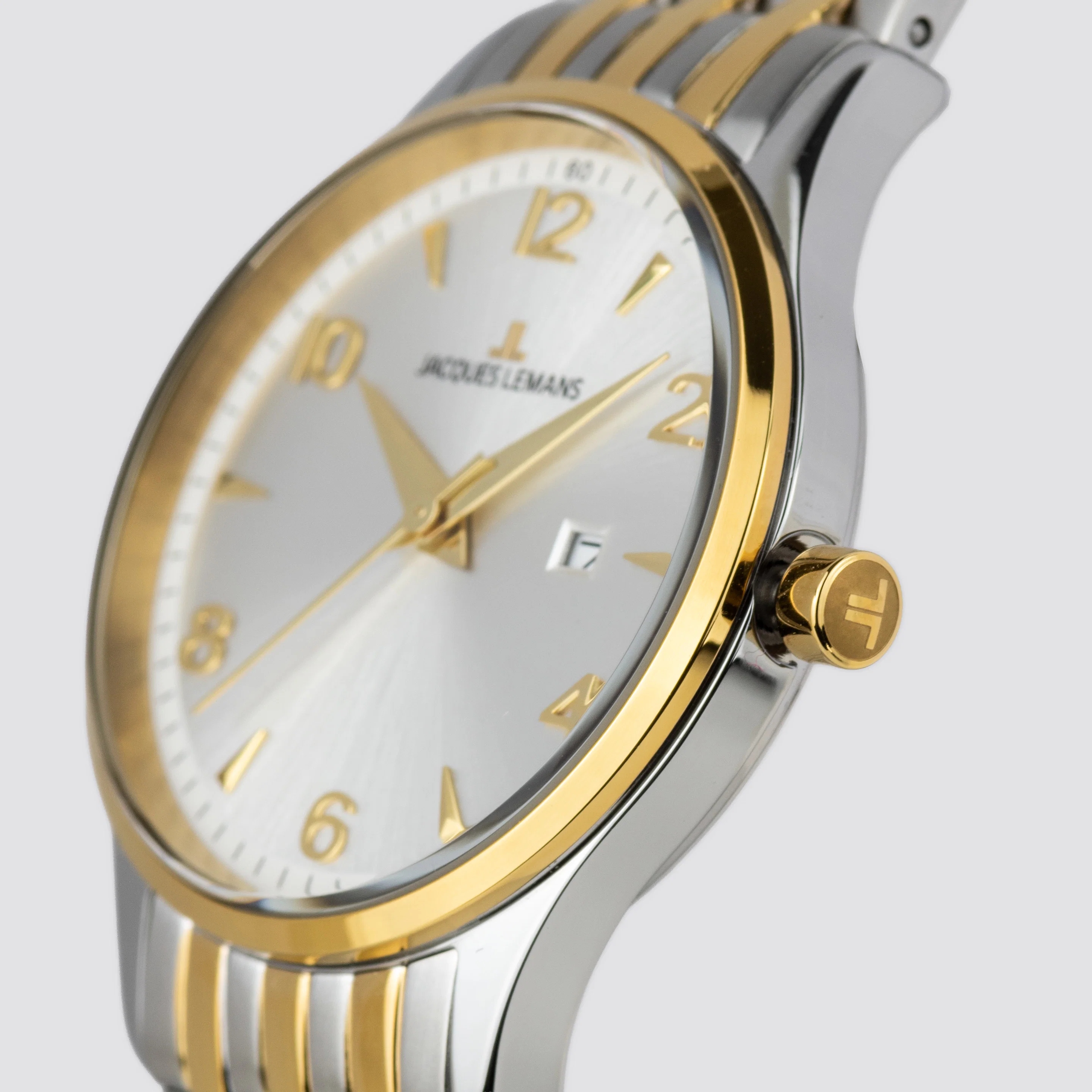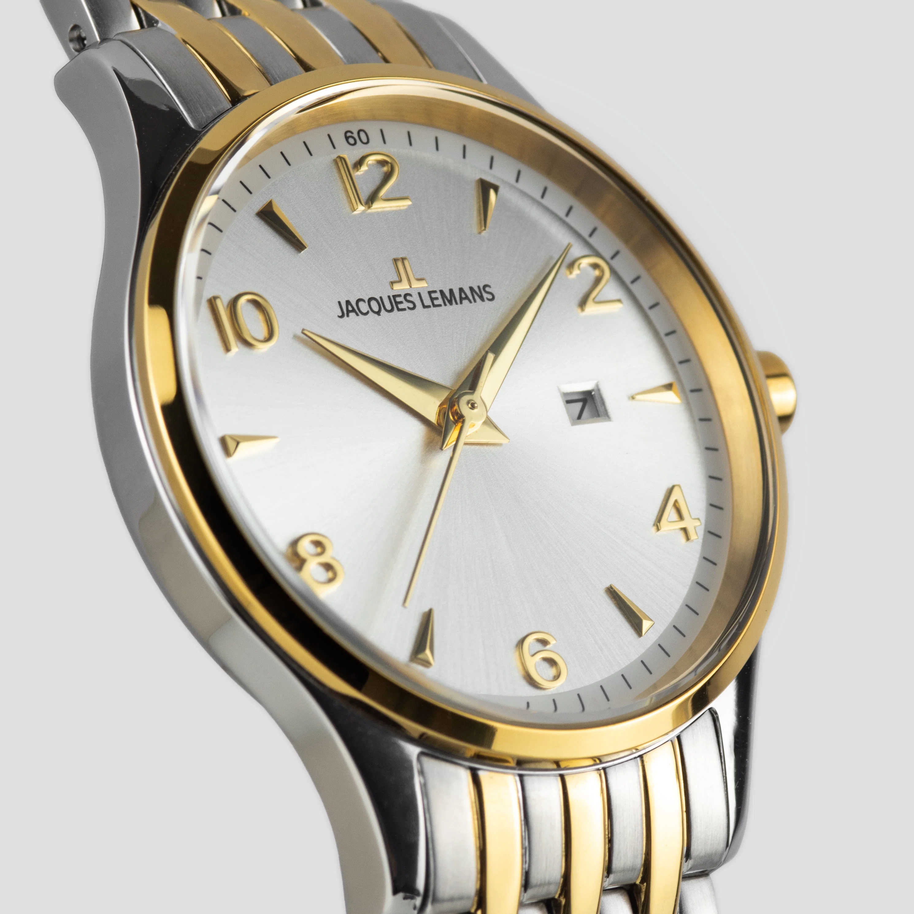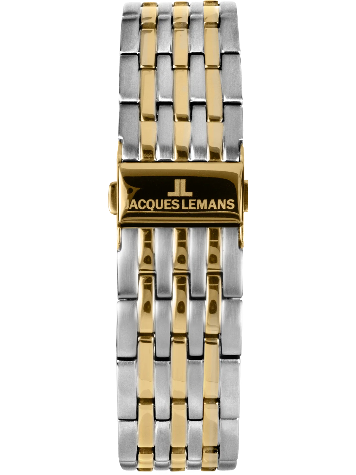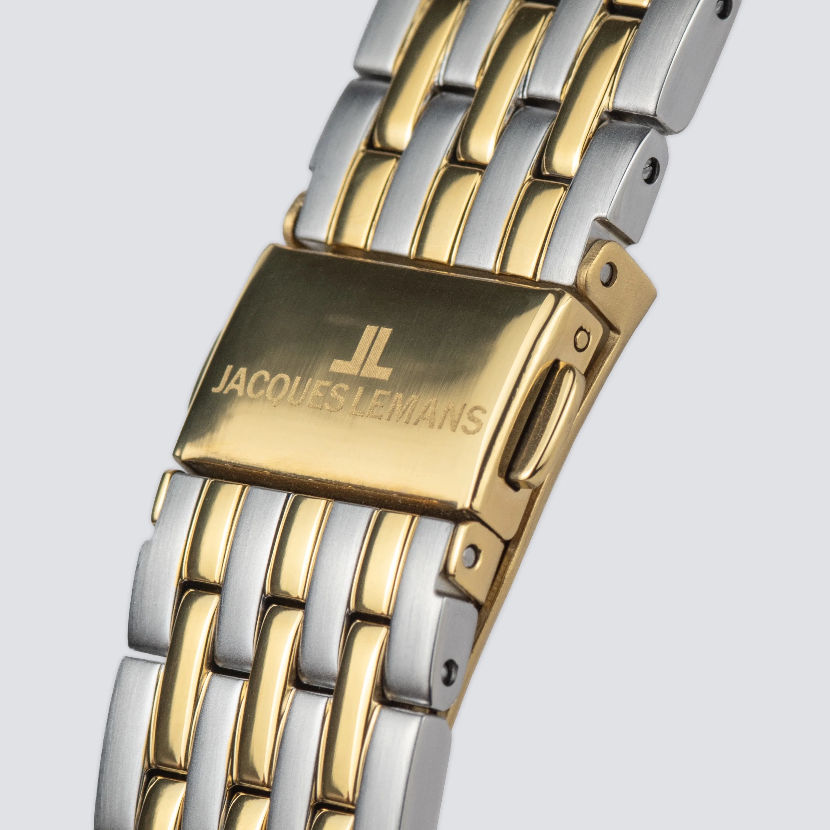 Классические женские часы Jacques Lemans, коллекция Classic London. Присутствует окошко даты. Циферблат закрывает фирменное минеральное стекло Crystex, повышенной прочности. Точность хода обеспечивает японский кварцевый механизм TMI. Браслет с раскладывающейся застежкой. Гарантия 2 года.