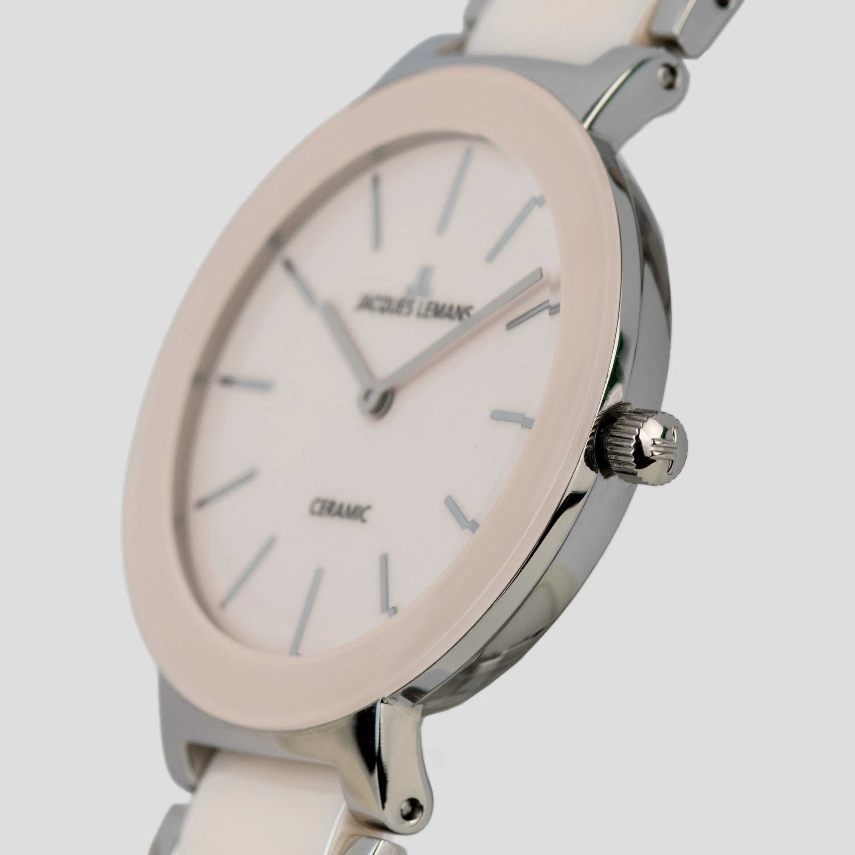 Женские кварцевые часы серии High Tech Ceramic от Jacques Lemans. Циферблат закрывает минеральное стекло Crystex повышенной прочности. Керамический безель. Браслет из нержавеющей стали с керамическими вставками и раскладывающейся застежкой. Гарантия 2 года.