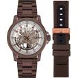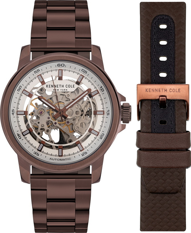 Мужские механические часы Kenneth Cole со скелетонизированным циферблатом и сменным ремешком в комплекте. Заводная головка с защитой. Прозрачная завинчивающаяся задняя крышка. Браслет с раскладывающейся защелкой. Гарантия 2 года.