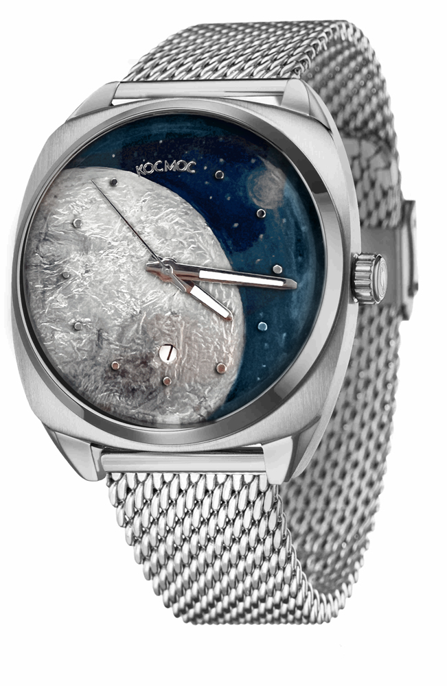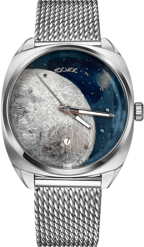 Вы когда-нибудь задумывались, как выглядит восход Земли с точки зрения находящегося на Луне? Современные космические аппараты позволяют каждому увидеть это явление в записи, а мастера бренда Космос воссоздали восход на Луне, используя технику лаковой миниатюры. На основу было нанесено несколько слоев лака и краски - их чередование создает эффект объема и ощущение динамики. Для передачи неоднородности лунного грунта использовали тончайший лист серебряной фольги. Насыщенно-синий цвет фона передает бескрайность космического пространства и служит фоном россыпи ярких звезд. Детали прорисовываются постепенно, тончайшей кистью: на один сюжет требуется до 50 часов работы. Процесс запекания миниатюры в специальной печи придет рисунку необходимый блеск и завершенность. Часы созданы в единственном экземпляре. В часах установлен механизм TMI с функцией автоподзавода. Кроме часов, минут и секунд здесь предусмотрено окошко  даты. За движением деталей механизма можно наблюдать, стоит только перевернуть часы: задняя крышка, закрепленная на 4-х винтах, прозрачна. Часовая и минутная стрелка покрыты люминесцентным составом, который светится в темноте. В модели установлено минеральное стекло.  Нити из нержавеющей стали в браслете складываются в особое плетение, названное «миланским». Оно придает браслету гибкости, сохраняя прочность. Специальная застежка позволяет легко регулировать длину браслета самостоятельно. Гарантия 24 месяца.