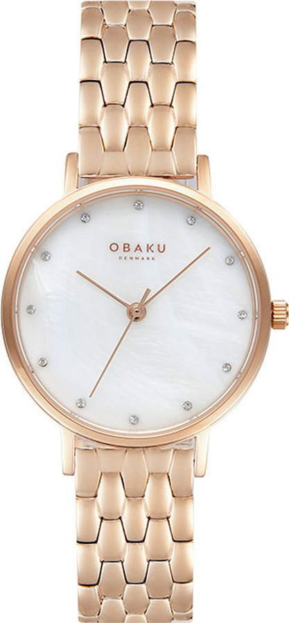 Стильные женские часы Obaku на браслете. Циферблат украшен кристаллами. Браслет с раскладывающейся застежкой. Гарантия 3 года.