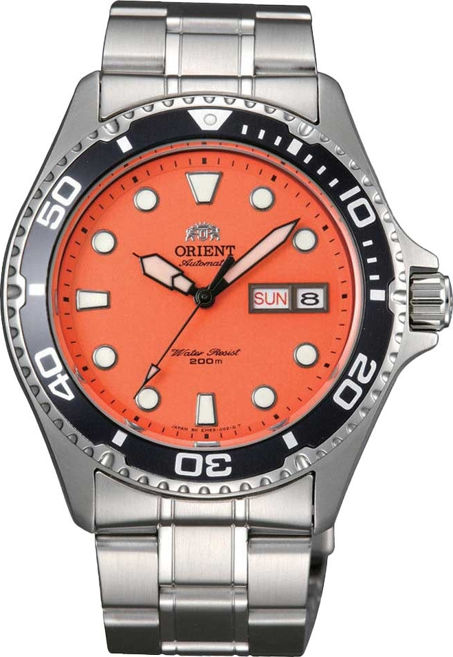 Мужские механические часы Orient Mako II с крупными метками и повышенной водозащитой. В механизме 22 камня, частота 21600 полуколебаний в час. Запас хода 40 часов. Возможность ручного завода. Функция stop-second. Противоударное устройство оси баланса. Присутствует окошко даты и дня недели. Завинчивающаяся заводная головка с защитой. Завинчивающаяся задняя крышка. Браслет с раскладывающейся защитой, застежка с блокировкой. Гарантия 2 года.