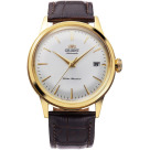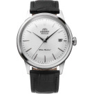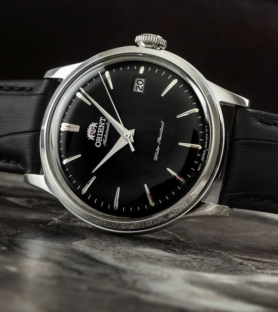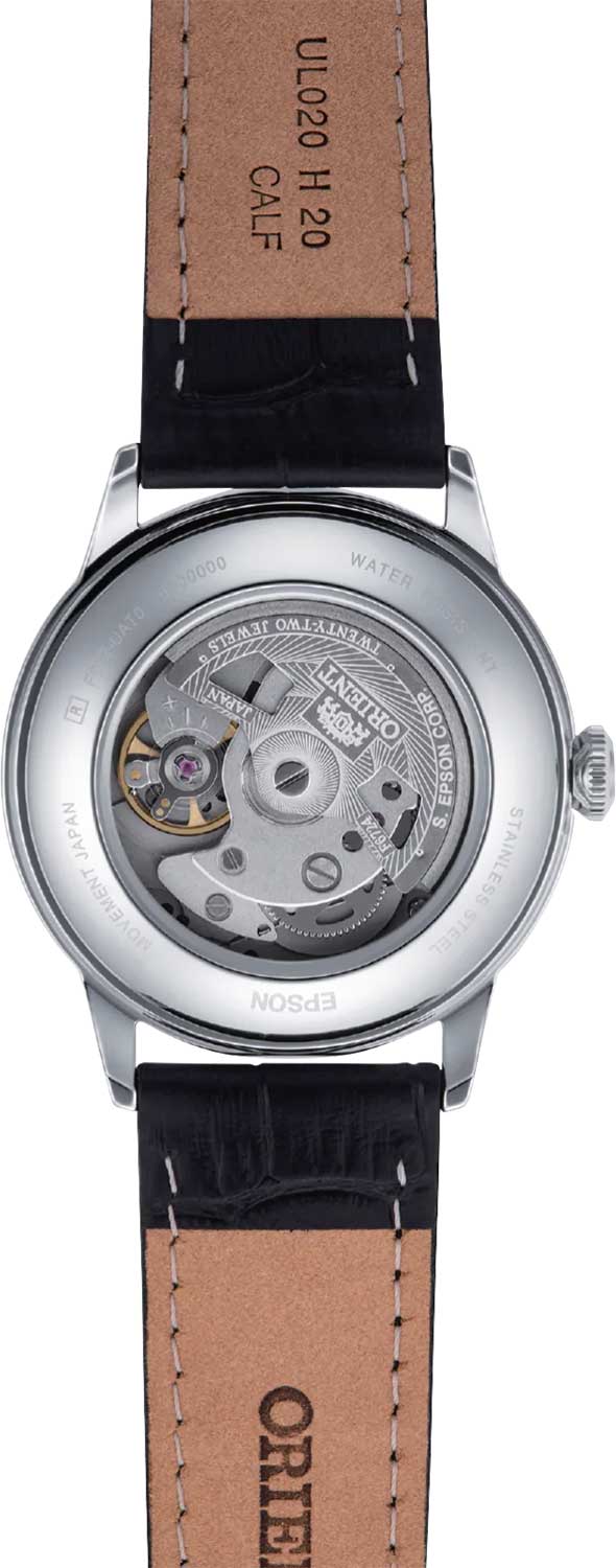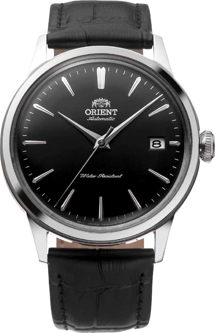 Мужские механические наручные часы Orient Classic Bambino 2-го поколения. В механизме 22 камня, частота 21600 полуколебаний в час. Запас хода 40 часов. Возможность ручного завода. Функция stop-second. Присутствует окошко даты. Циферблат закрывает выпуклое минеральное стекло. Прозрачная задняя крышка. Ремешок с классической застежкой. Вес часов 53 грамма. Гарантия 2 года.