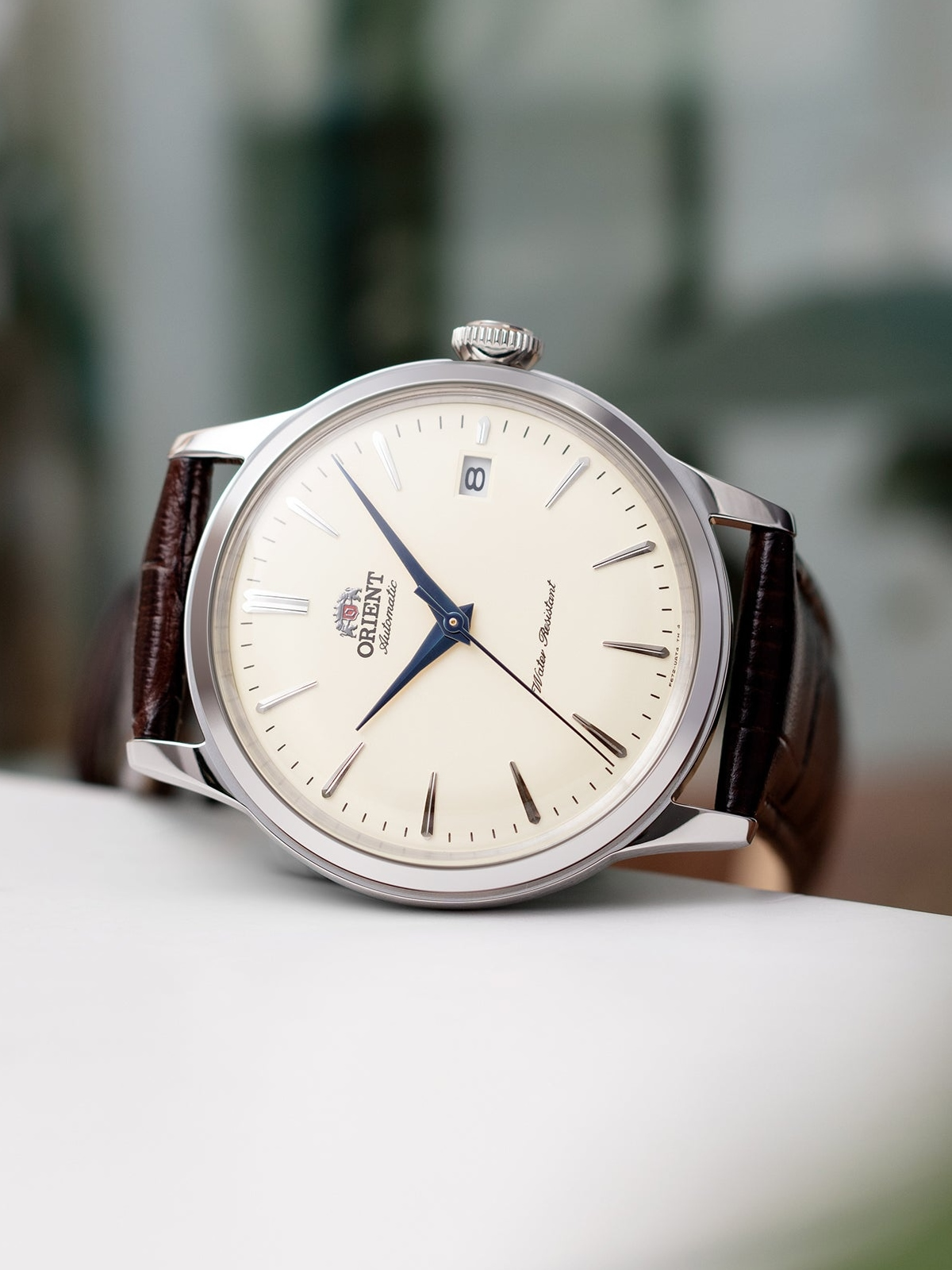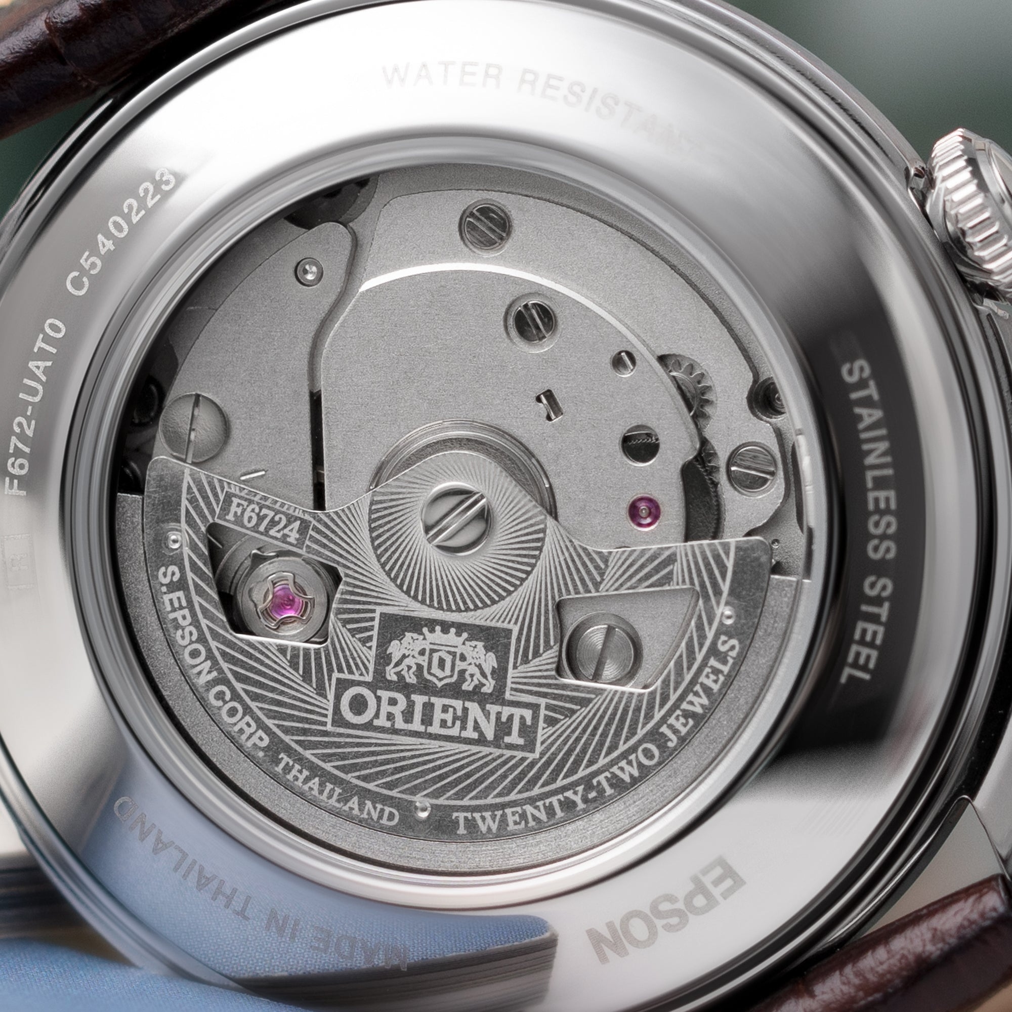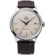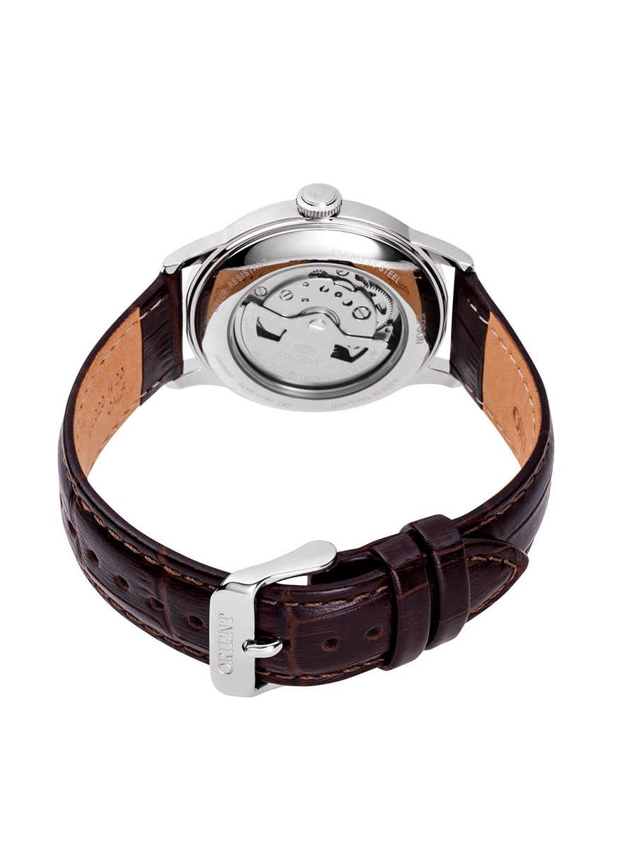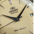 Мужские механические наручные часы Orient Classic Bambino 2-го поколения. В механизме 22 камня, частота 21600 полуколебаний в час. Запас хода 40 часов. Возможность ручного завода. Функция stop-second. Присутствует окошко даты. Циферблат закрывает выпуклое минеральное стекло. Прозрачная задняя крышка. Ремешок с классической застежкой. Вес часов 53 грамма. Гарантия 2 года.