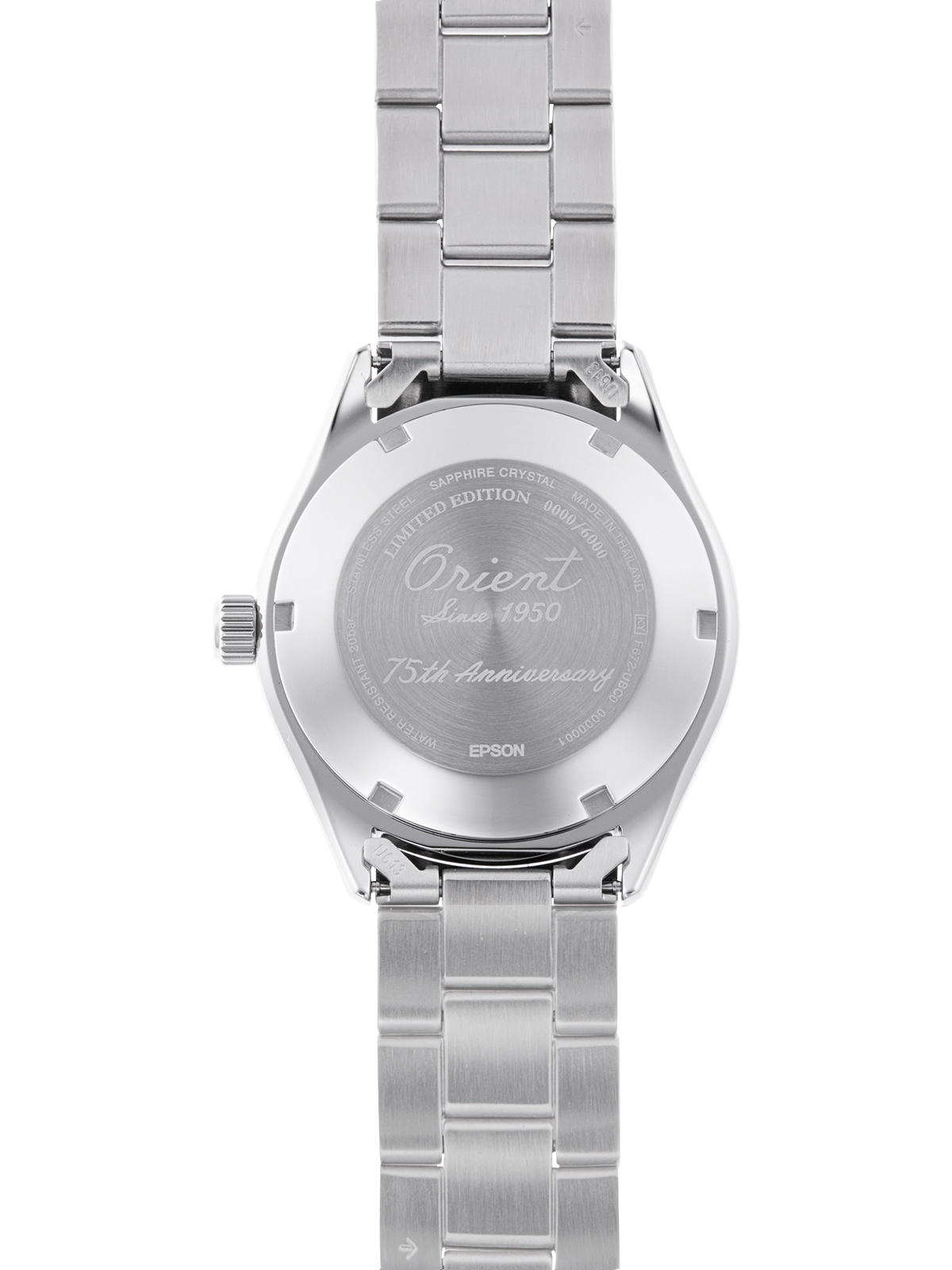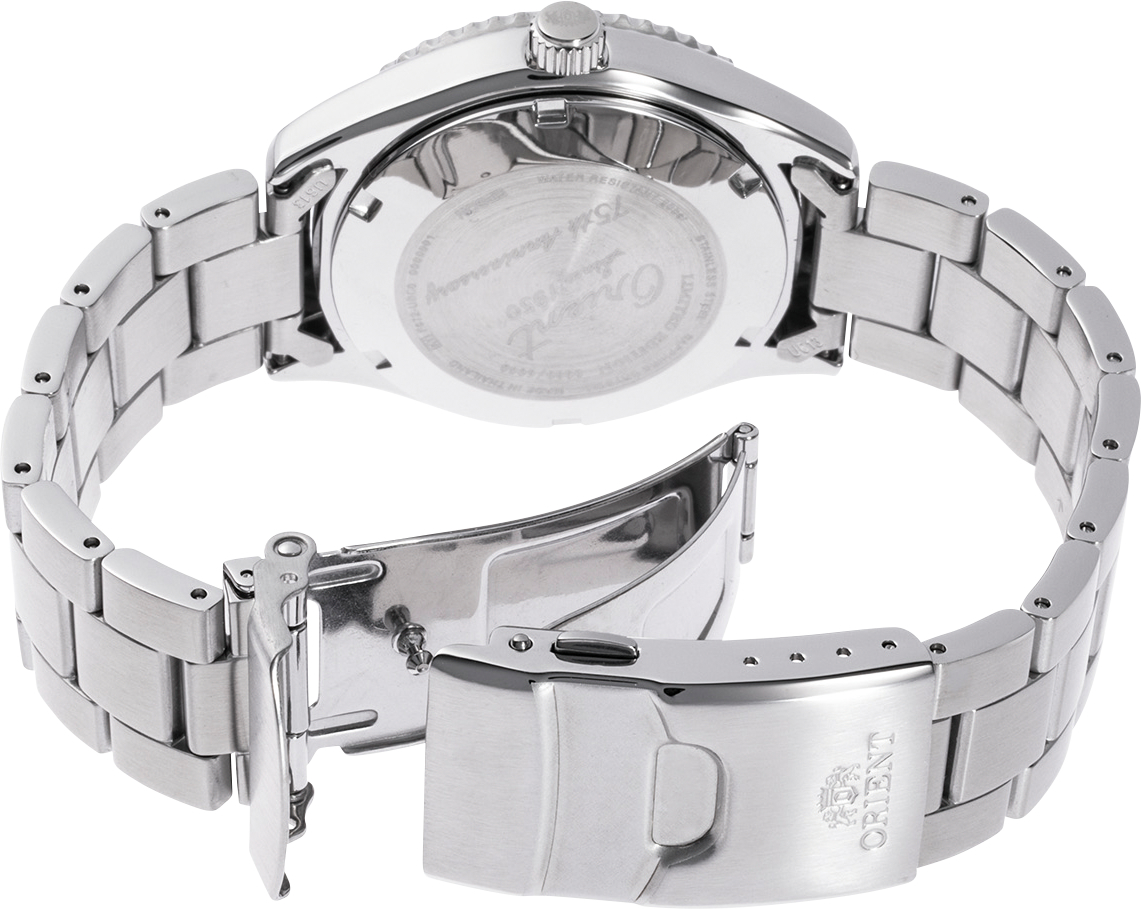 Мужские механические часы с автоподзаводом. Лимитированная серия, подготовленная к 75-ти летию Orient, 6000 экземпляров. В механизме 22 камня, частота 21600 полуколебаний в час. Запас хода 40 часов. Функция stop-second. Возможность ручного завода. Циферблат защищен прочным сапфировым стеклом, устойчивым к потертостям и царапинам. Безель вращается на 120 щелчков в одном направлении. Присутствует окошко даты. Завинчивающиеся заводная головка и задняя крышка. Браслет с раскладывающейся застежкой, застежка с системой блокировки, обхват запястья от 140 до 200 мм. Вес часов 165 грамм. Гарантия 2 года.