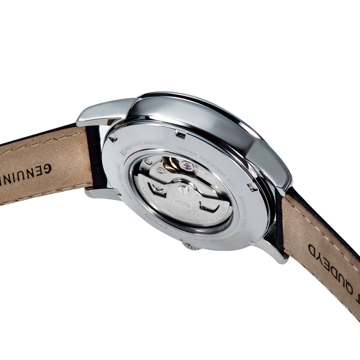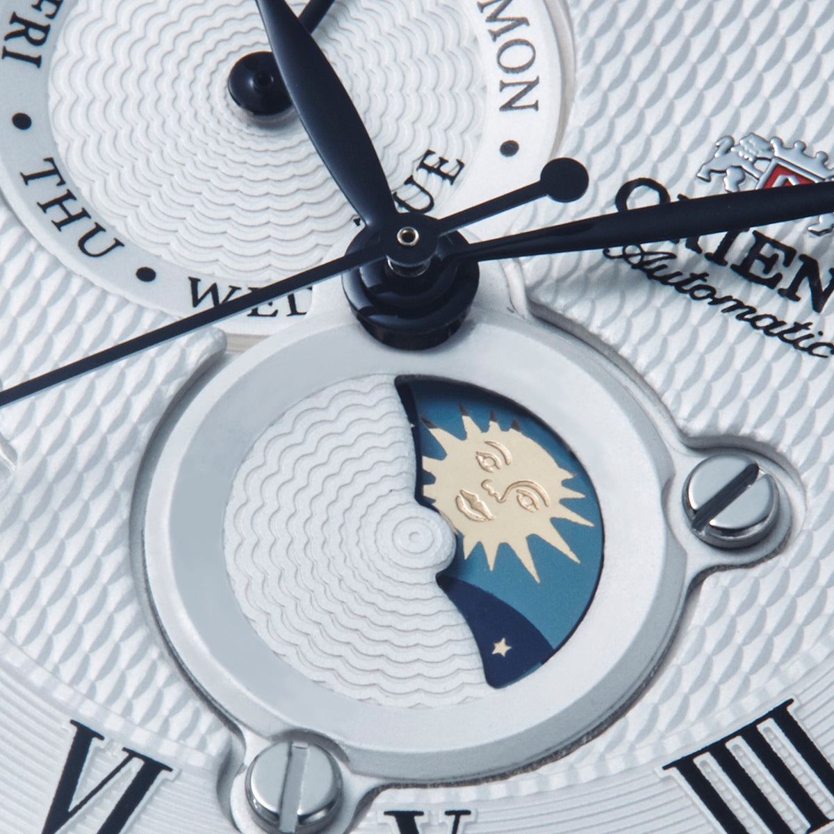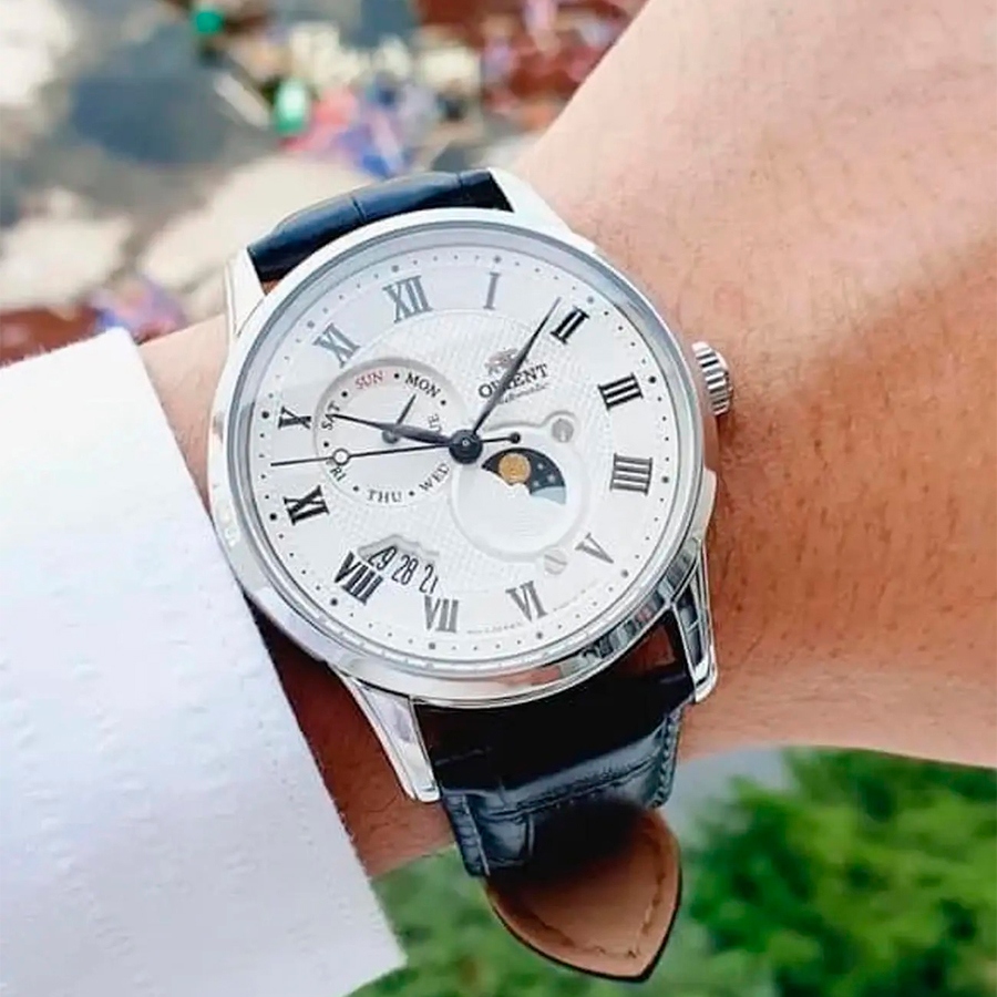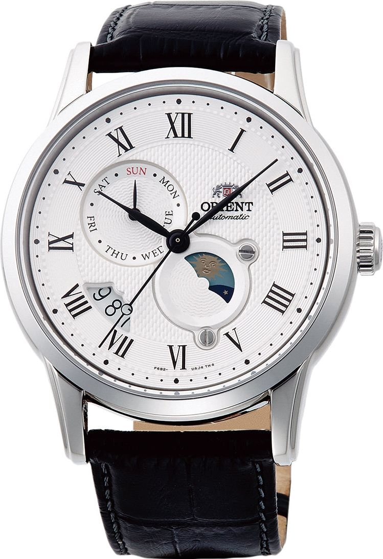 Мужские механические часы с автоподзаводом от Orient. В механизме 22 камня, частота 21600 полуколебаний в час. Запас хода 40 часов. Возможность ручного завода. Присутствует окошко даты. День недели отображается на отдельном циферблате. Индикатор день/ночь. Завинчивающаяся прозрачная задняя крышка. Ремешок с раскладывающейся застежкой. Гарантия 2 года.