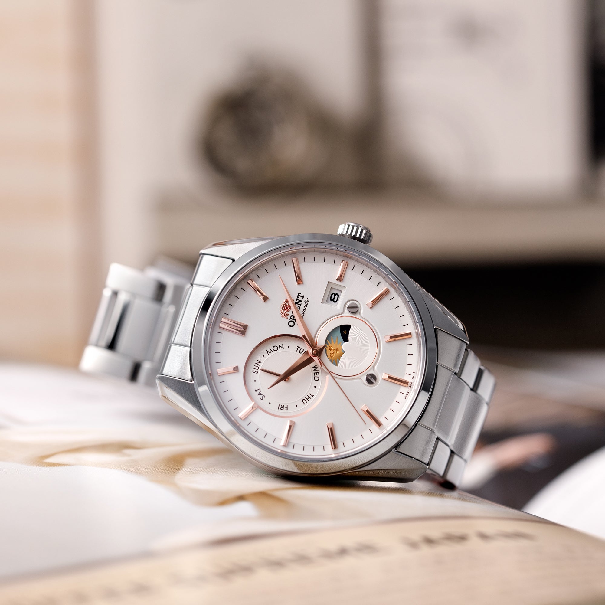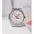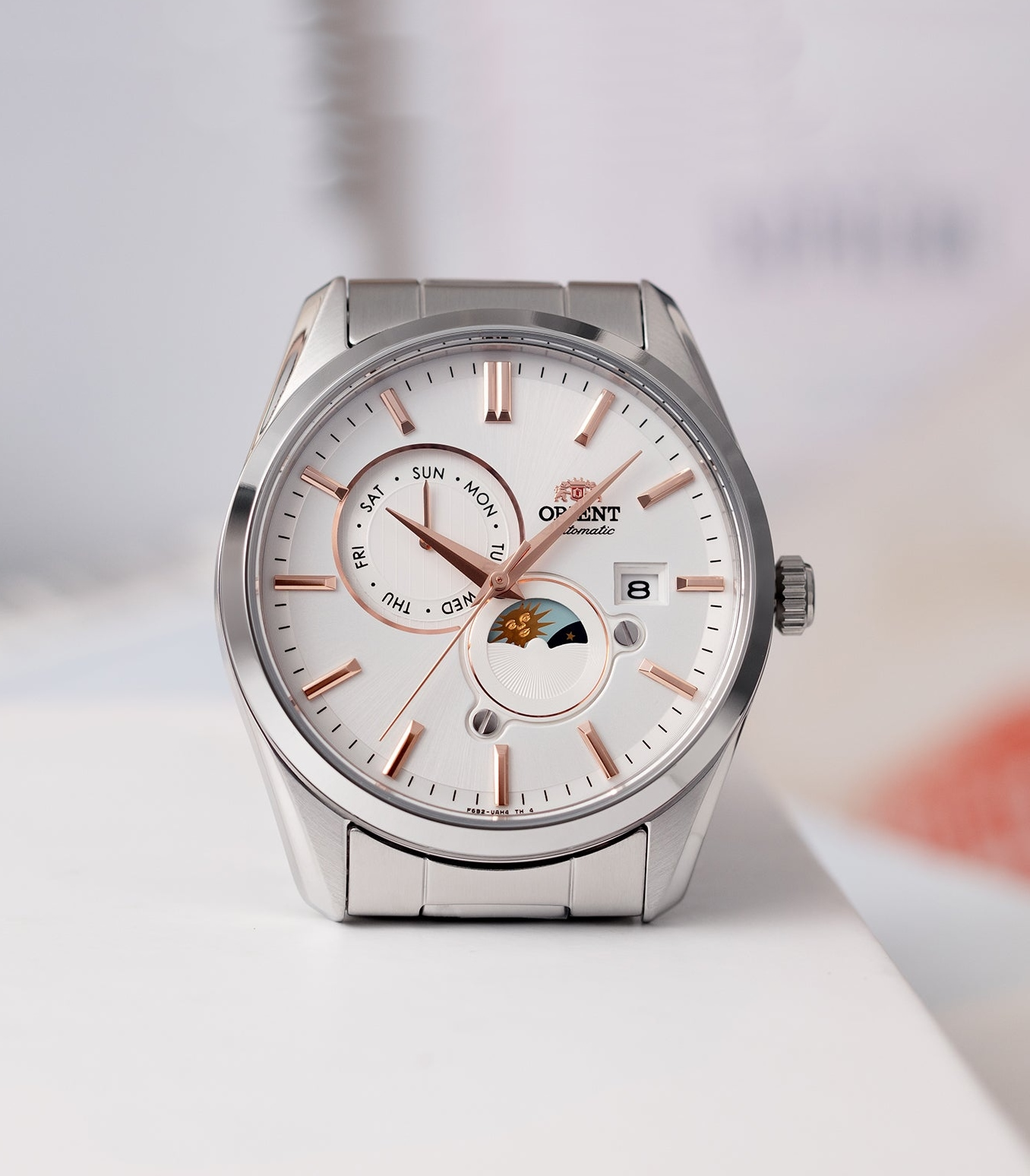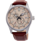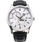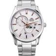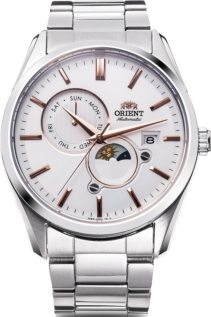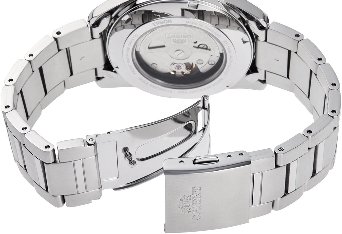 Мужские механические наручные часы Orient Automatic. Механизм калибра F6B24 с автоподзаводом и возможностью ручного завода. В механизме 22 камня, частота 21600 полуколебаний в час. Запас хода 40 часов. На отдельных циферблатах отображаются день недели и индикатор день/ночь, также присутствует апертура текущей даты. Завинчивающаяся прозрачная задняя крышка. Браслет с раскладывающейся застежкой. Гарантия 2 года.