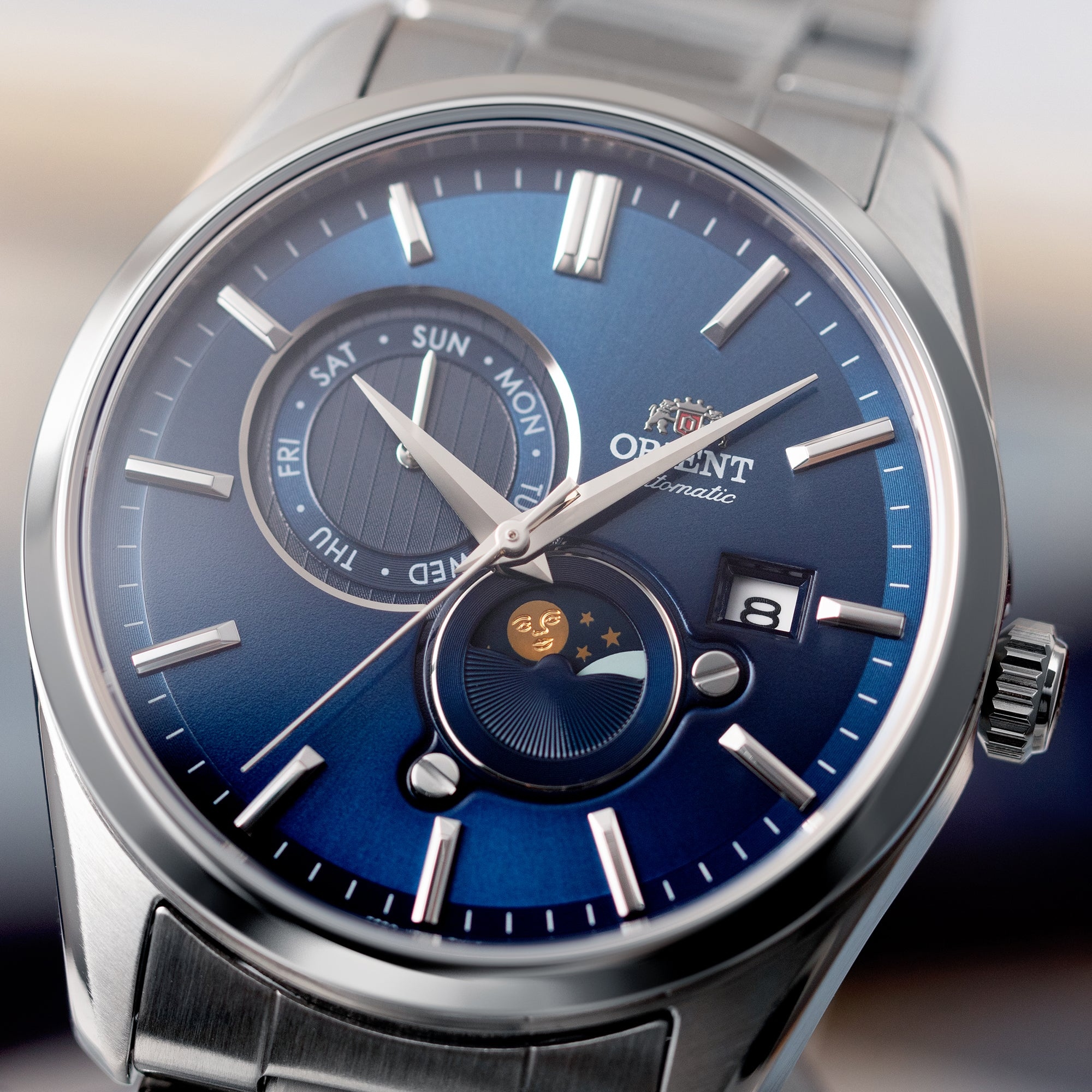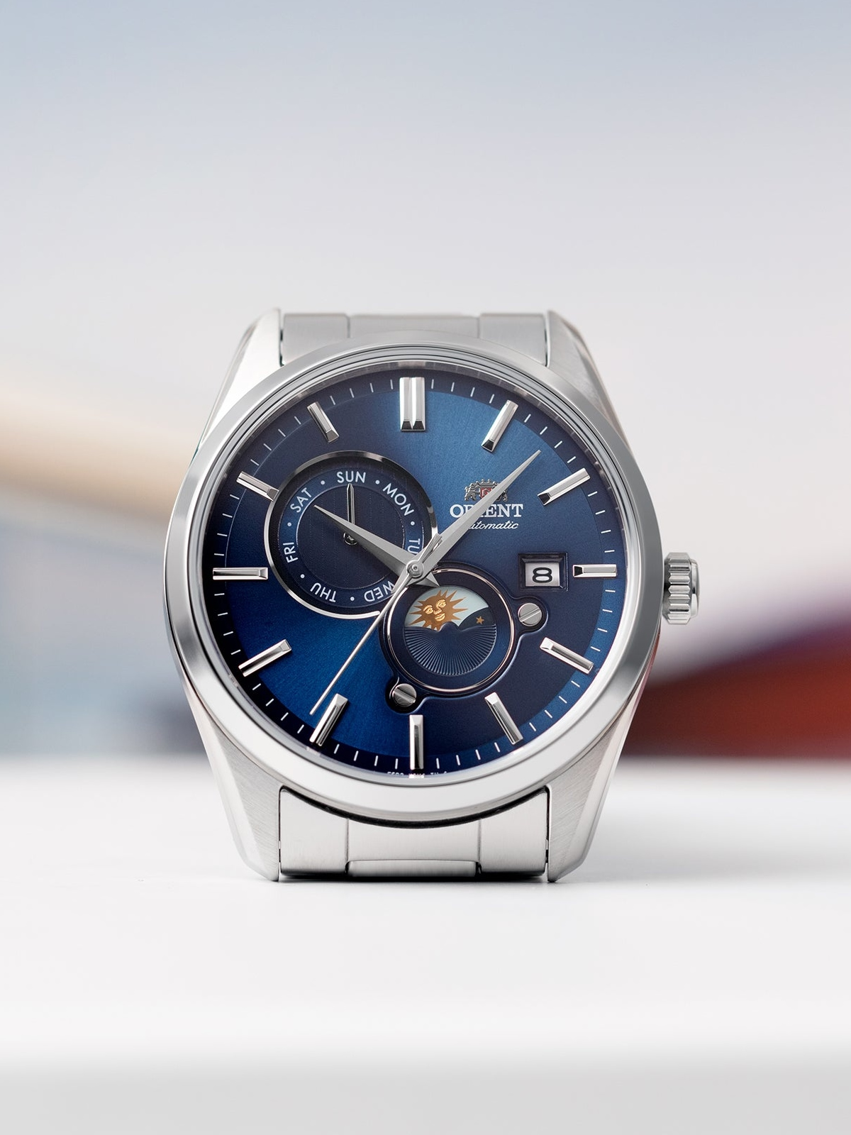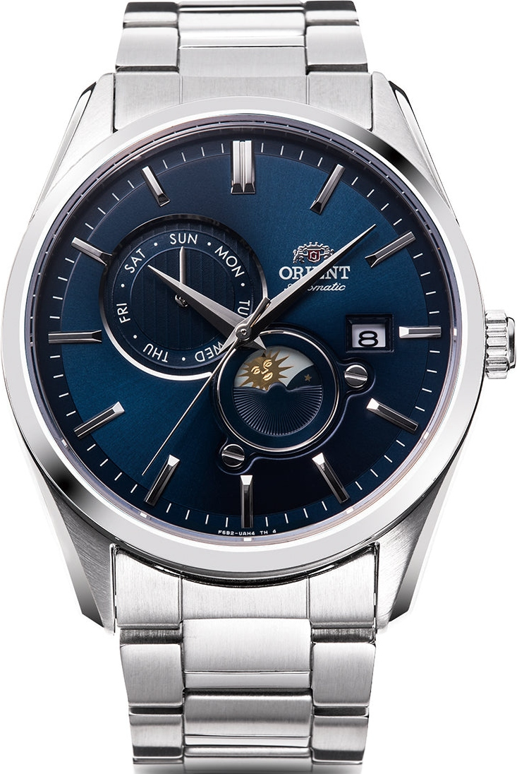 Мужские механические наручные часы Orient Automatic. Механизм калибра F6B24 с автоподзаводом и возможностью ручного завода. В механизме 22 камня, частота 21600 полуколебаний в час. Запас хода 40 часов. На отдельных циферблатах отображаются день недели и индикатор день/ночь, также присутствует апертура текущей даты. Завинчивающаяся прозрачная задняя крышка. Браслет с раскладывающейся застежкой. Гарантия 2 года.