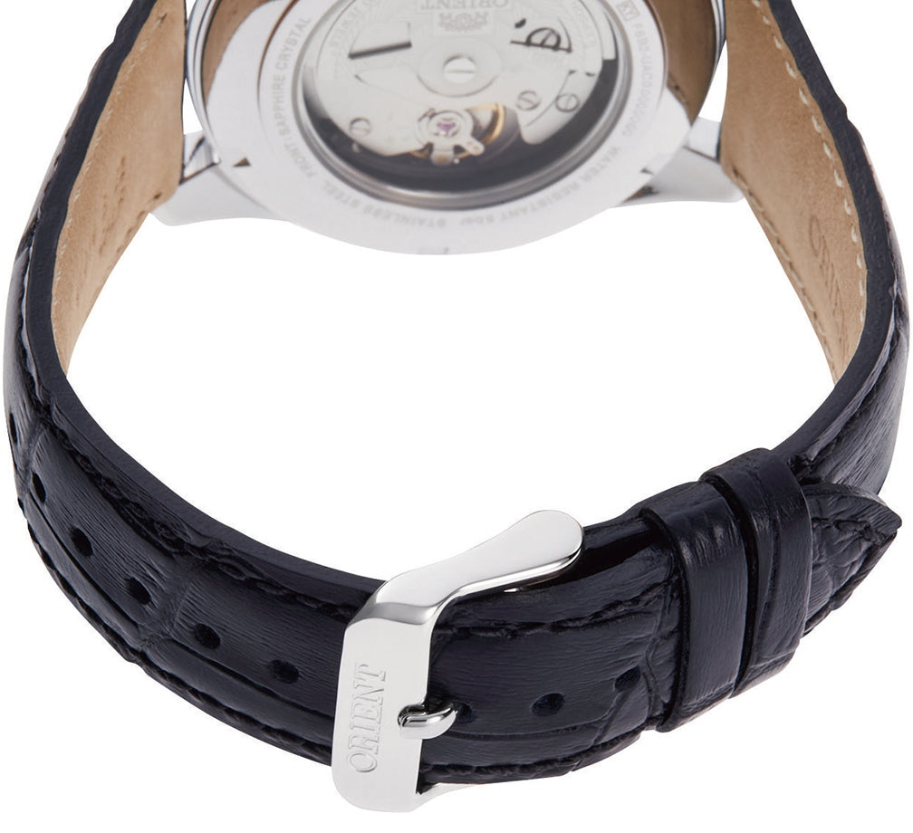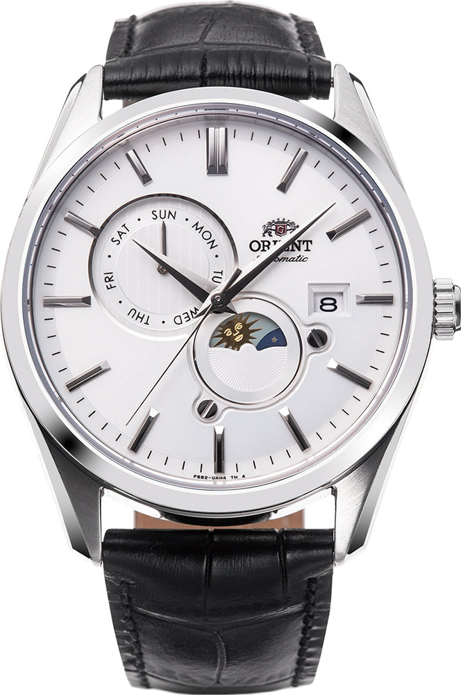 Мужские механические наручные часы Orient Automatic. Механизм калибра F6B24 с автоподзаводом и возможностью ручного завода. В механизме 22 камня, частота 21600 полуколебаний в час. Запас хода 40 часов. На отдельных циферблатах отображаются день недели и индикатор день/ночь, также присутствует апертура текущей даты. Завинчивающаяся прозрачная задняя крышка. Ремешок из натуральной кожи с классической застежкой. Гарантия 2 года.