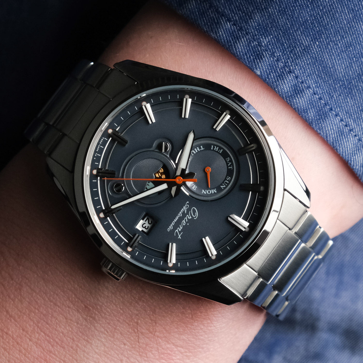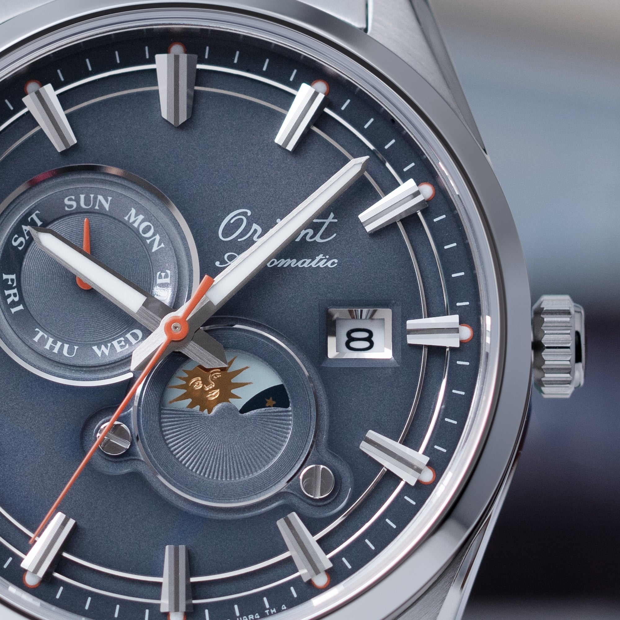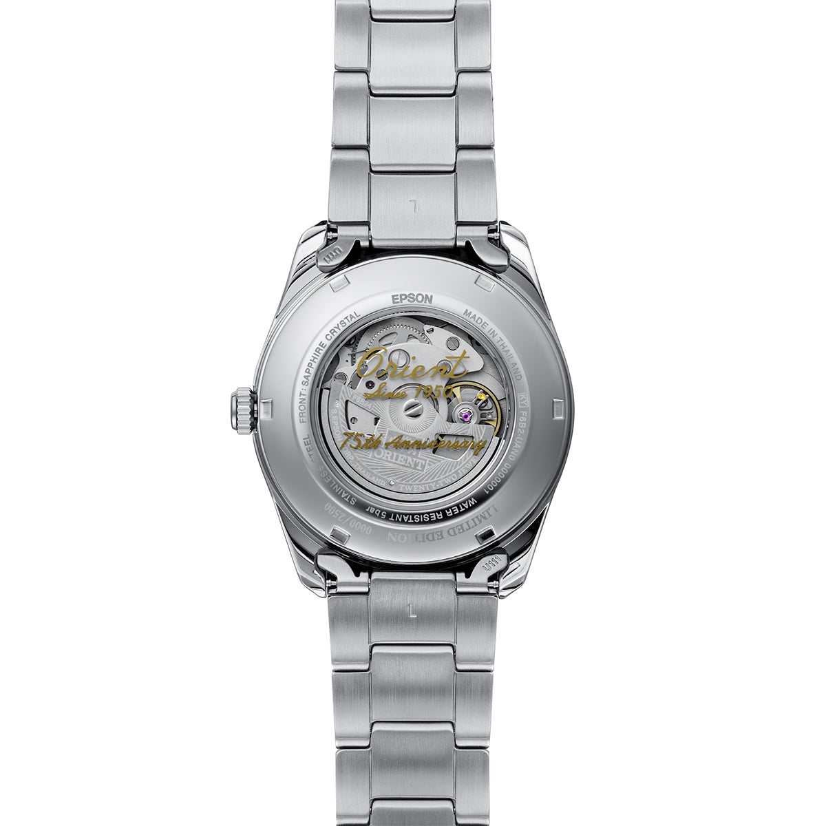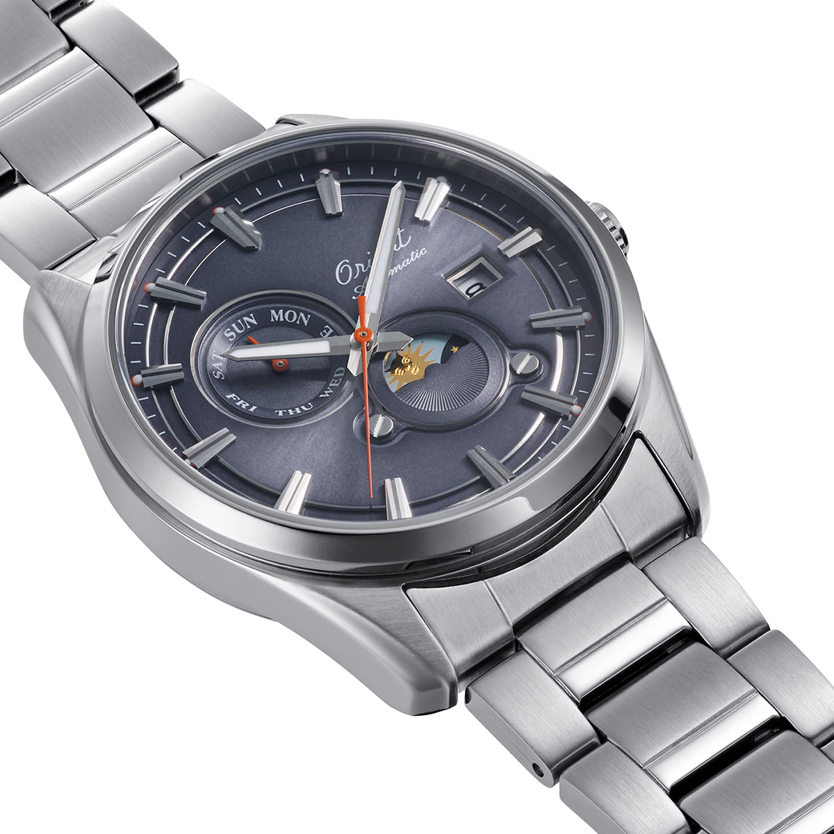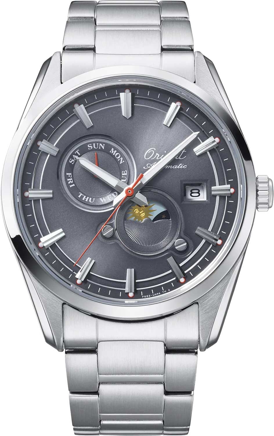 Мужские механические наручные часы Orient Automatic Stretto 75th Anniversary. Лимитированная серия — 2500 экземпляров. Модель посвящена 75-летию компании Orient. Механизм калибра F6B24 с автоподзаводом и возможностью ручного завода. В механизме 22 камня, частота 21600 полуколебаний в час. Запас хода 40 часов. На отдельных циферблатах отображаются день недели и индикатор день/ночь, также присутствует апертура текущей даты. Завинчивающаяся прозрачная задняя крышка. Браслет с раскладывающейся застежкой. Гарантия 2 года.