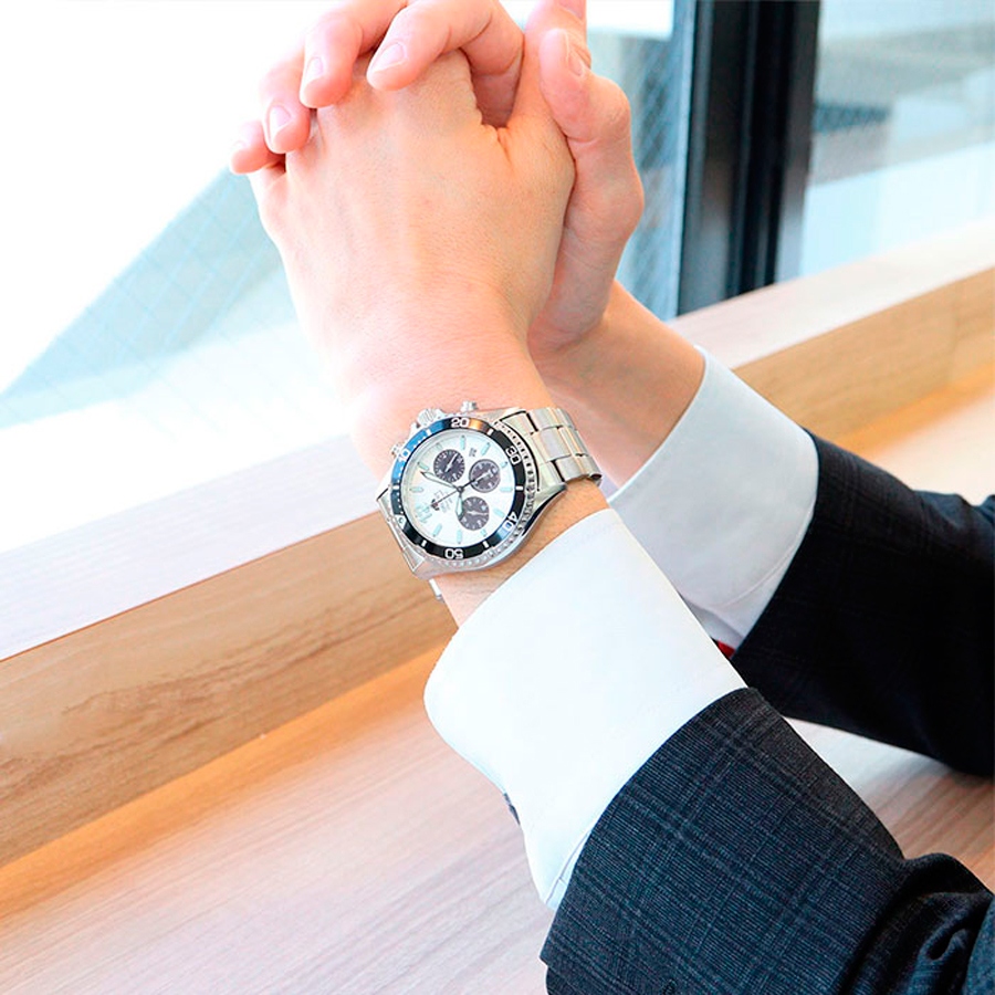 Мужские наручные часы-хронограф с секундомером. Питание от солнечной энергии. Запас хода при полном заряде батарейки составляет 6 месяцев. Секундомер с точностью 1 сек. и временем измерения 60 мин. Секундная стрелка вынесена на отдельный циферблат. Дополнительно на малом циферблате отображается текущее время в 24-х часовом формате. Присутствует окошко даты. Безель вращается на 120 щелчков в одном направлении. Завинчивающаяся заводная головка с защитой. Завинчивающаяся задняя крышка украшена гравировкой. Браслет с раскладывающейся застежкой, застежка с системой блокировки, обхват запястья от 140 до 200 мм. Вес часов 167 грамм. Гарантия 2 года.