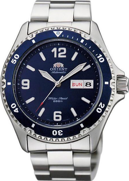 Мужские механические часы Orient Mako II с крупными арабскими цифрами и повышенной водозащитой. В механизме 22 камня, частота 21600 полуколебаний в час. Запас хода 40 часов. Возможность ручного завода. Функция stop-second. Противоударное устройство оси баланса. Присутствует окошко даты и дня недели. Завинчивающаяся заводная головка с защитой. Завинчивающаяся задняя крышка. Браслет с раскладывающейся защитой, застежка с блокировкой. Гарантия 2 года.
