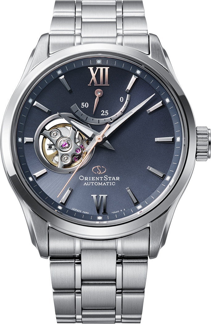 Мужские механические наручные часы Orient Star. Открытый баланс хода. Калибр механизма F6R42 на 22 камнях. Частота 21 600 полуколебаний в час. Запас хода 50 часов. Возможность ручного завода. Ретроградный указатель запаса хода до 50 часов. Циферблат закрывает устойчивое к потертостям и царапинам сапфировое стекло, дополненное антибликовым покрытием. Завинчивающаяся прозрачная задняя крышка. Браслет с раскладывающейся застежкой. Гарантия 1 год.