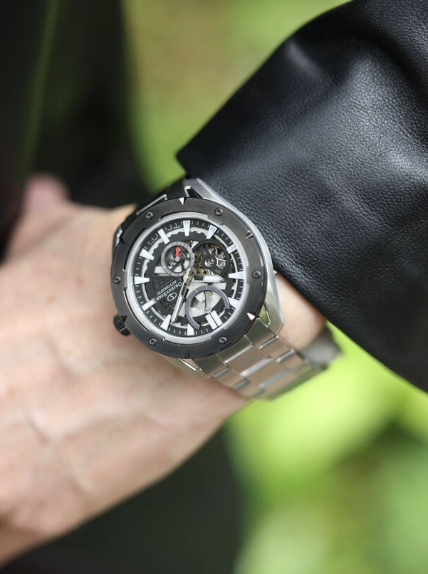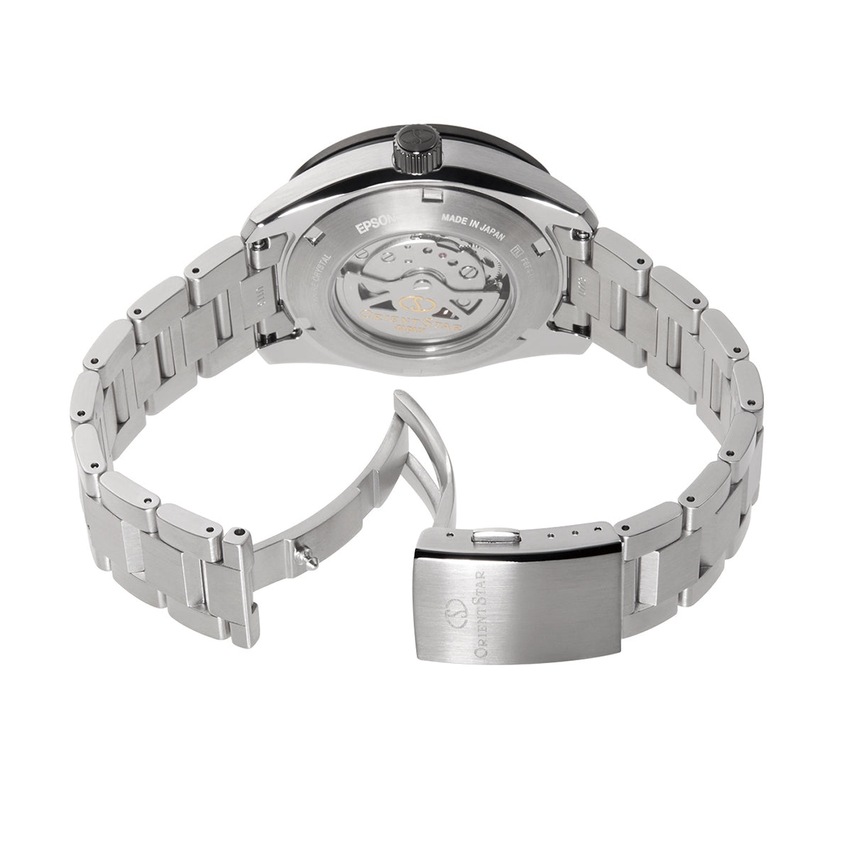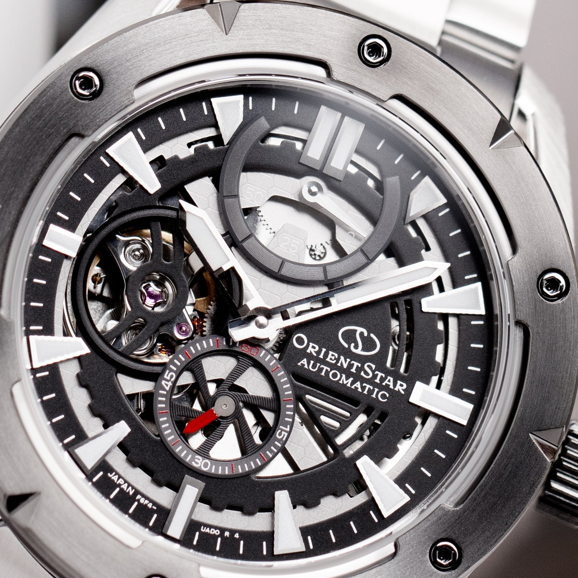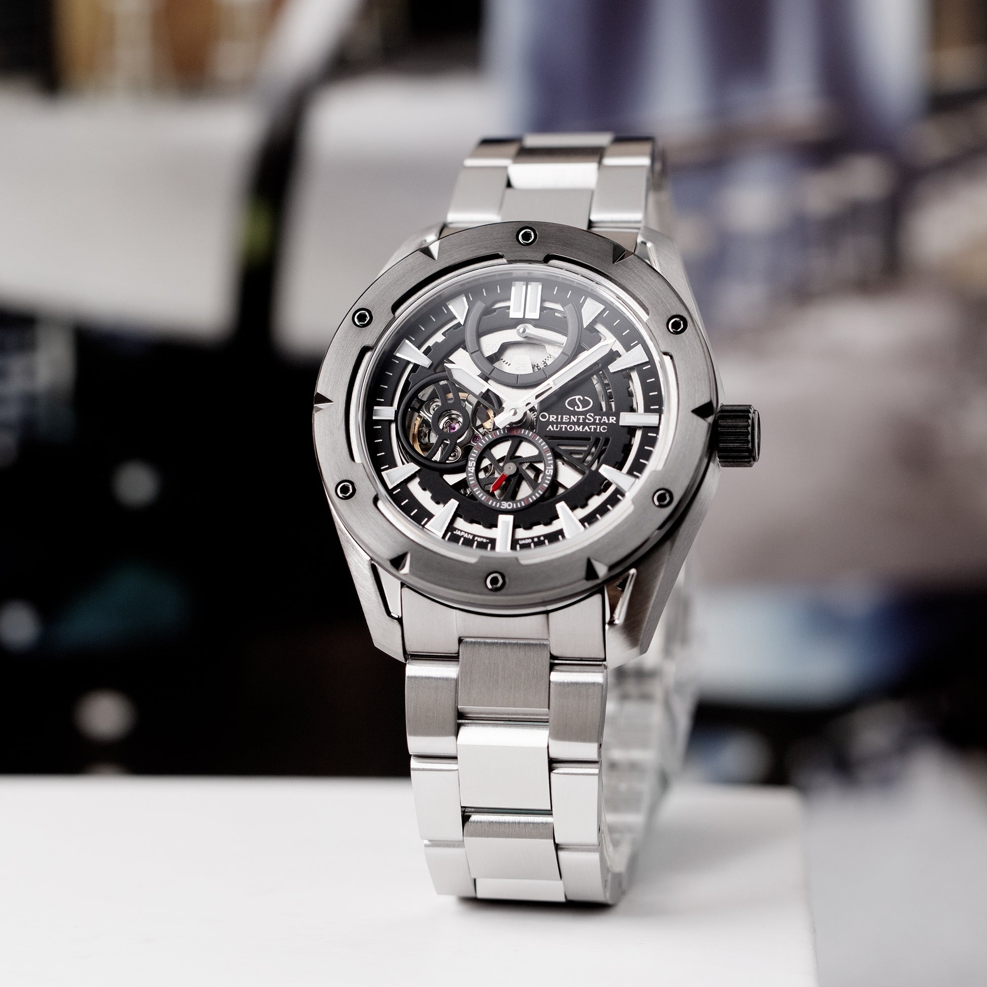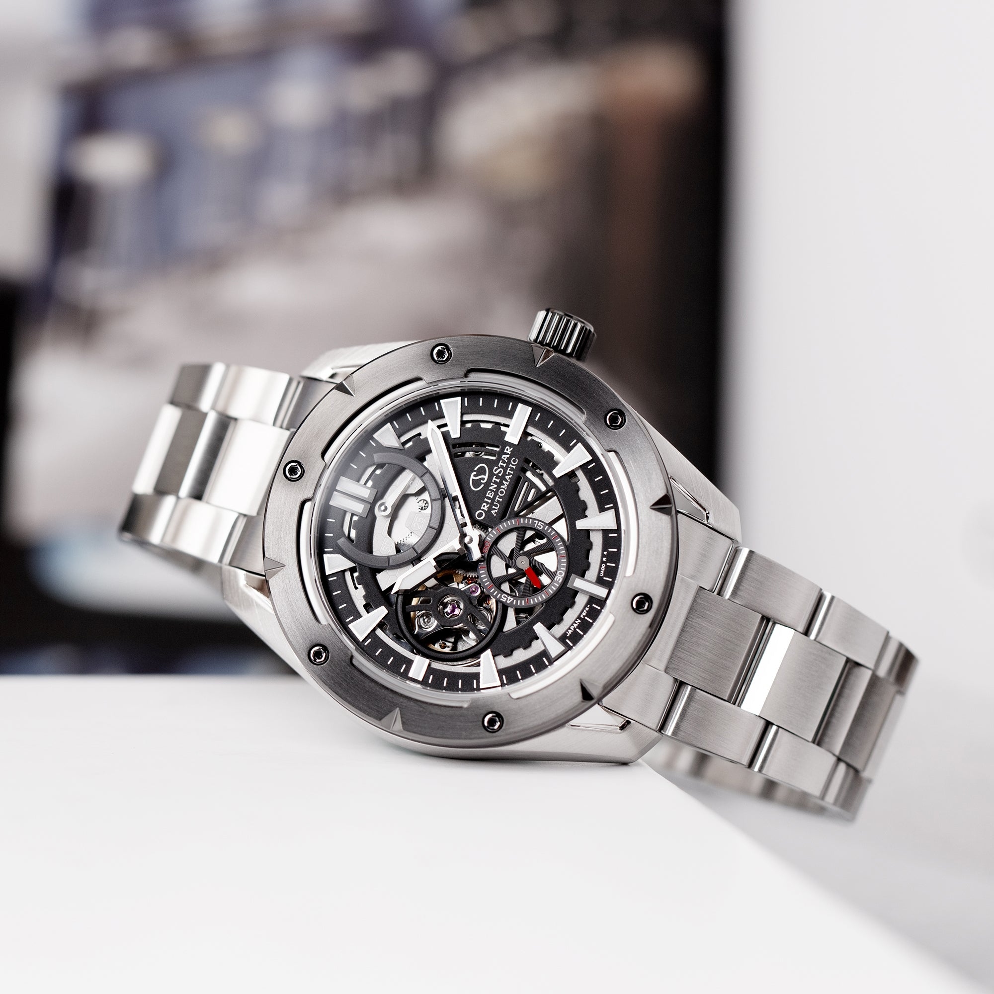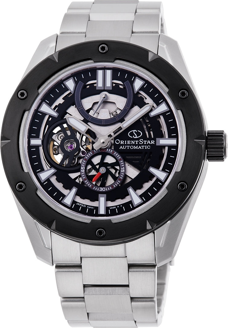 Мужские механические наручные часы Orient Star. Модель Modern Skeleton сочетает в себе механическую привлекательность часов-скелетонов и простой современный дизайн. В механизме 24 камня, частота 21600 полуколебаний в час. Ретроградный индикатор запаса хода на 50 часов. Возможность ручного завода. Секундная стрелка вынесена на отдельный циферблат. Циферблат закрывает устойчивое к потертостям и царапинам сапфировое стекло с антибликовым покрытием. Сквозь прозрачное окошко на циферблате можно наблюдать работу механизма часов. Завинчивающаяся прозрачная задняя крышка. Завинчивающаяся заводная головка. Браслет с раскладывающейся застежкой, обхват запястья от 140 до 200 мм. Вес часов 172 грамма. Гарантия 1 год.