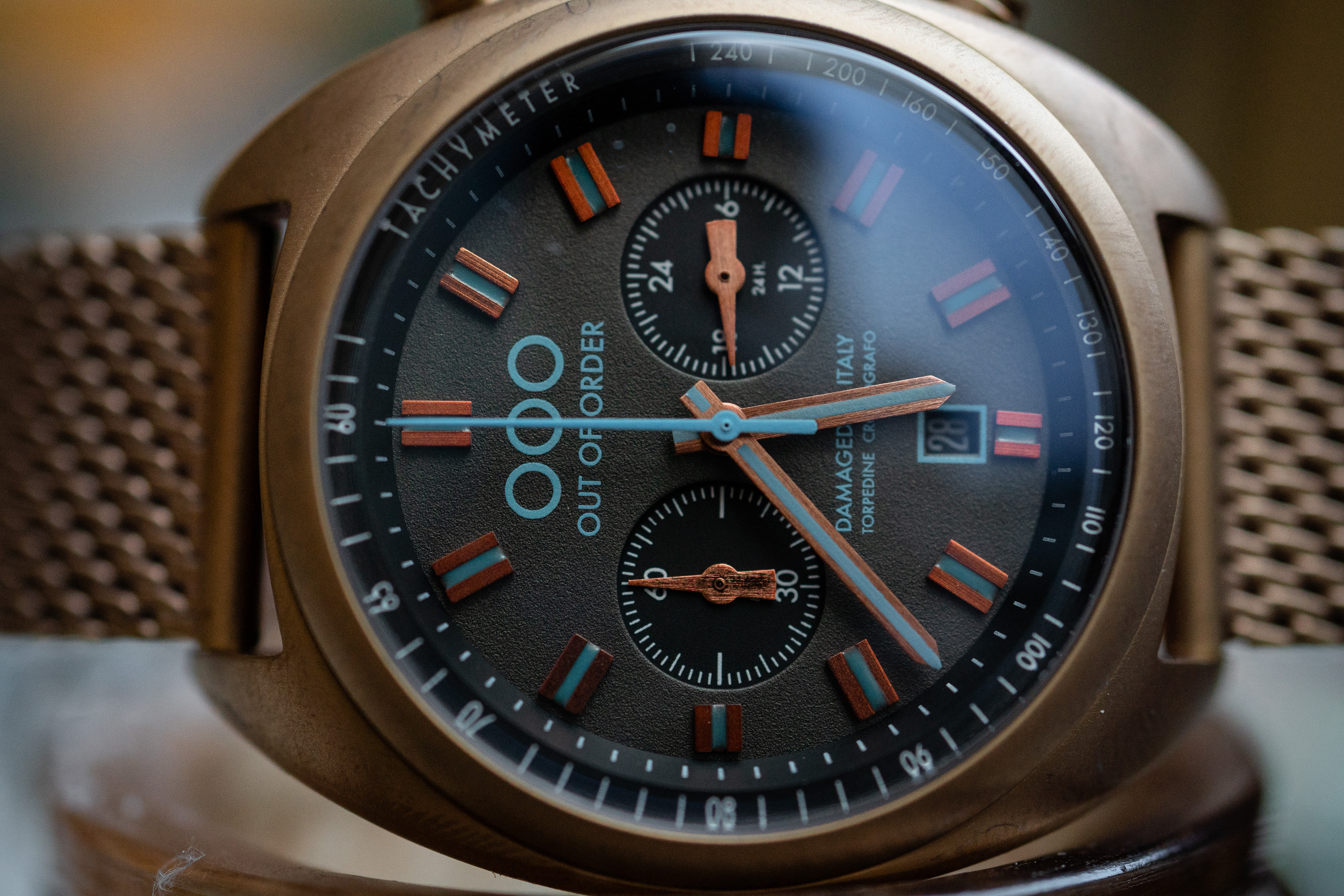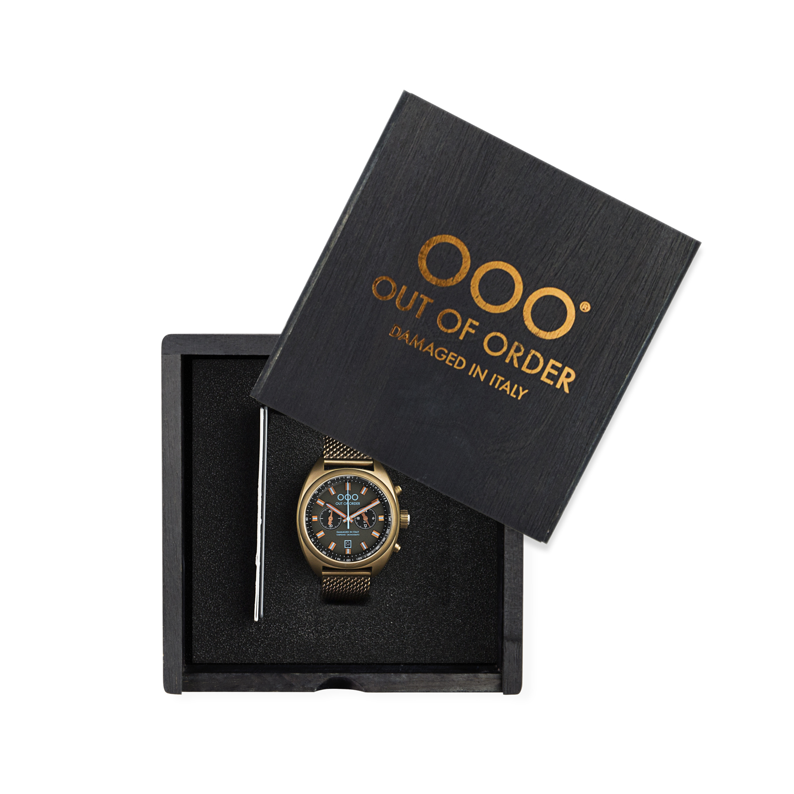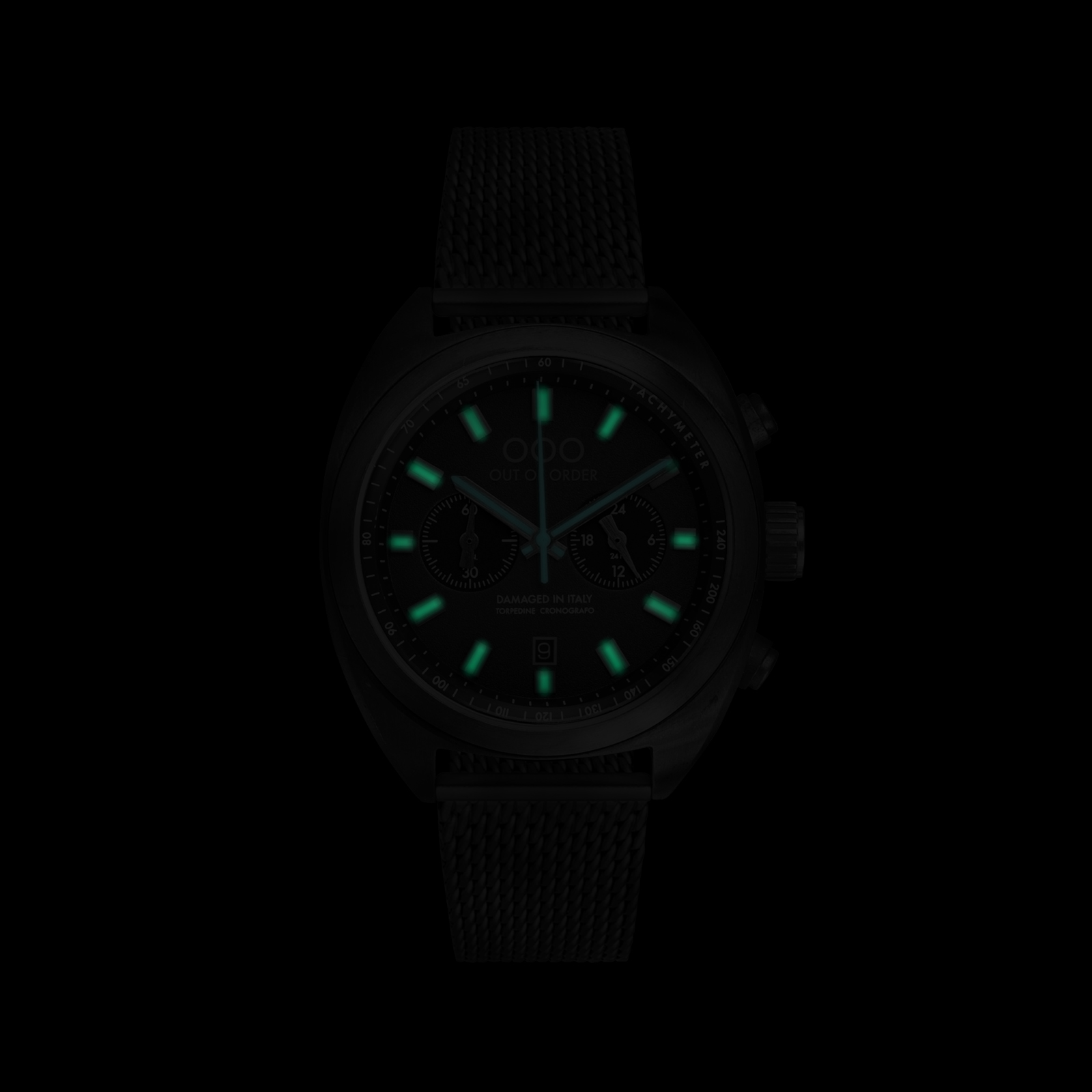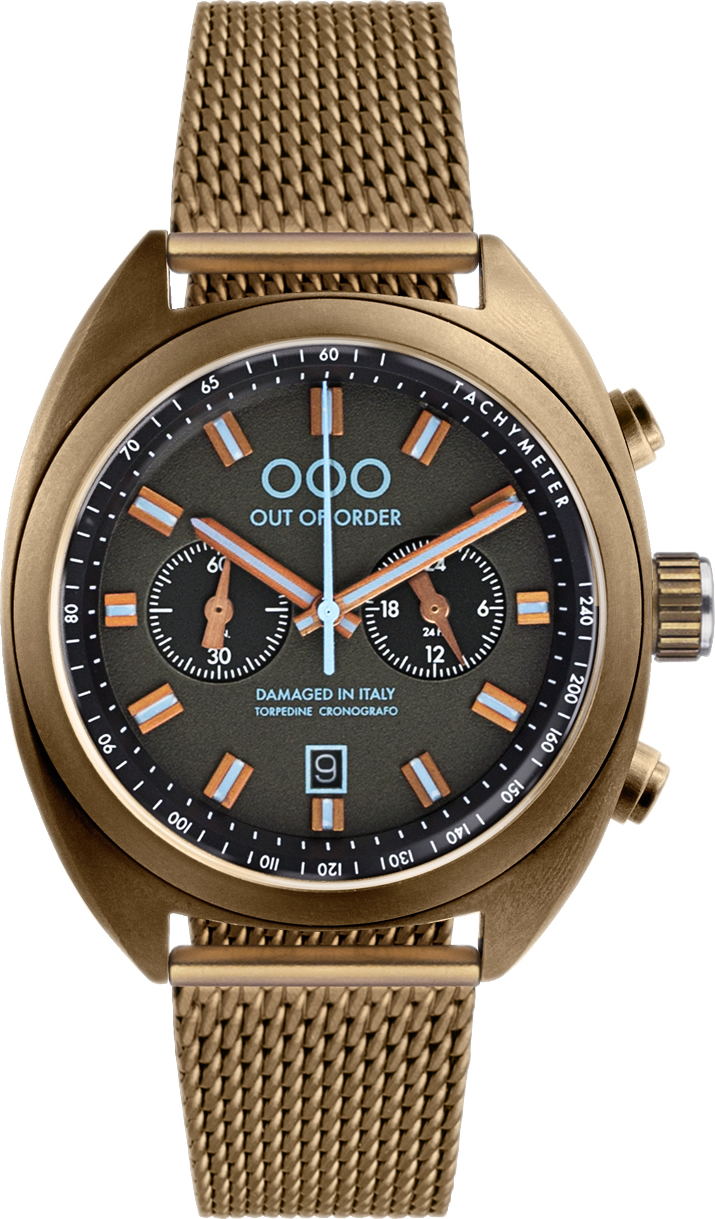 Наручные мужские часы Out of Order OOO.001?12.NE.BL из коллекции Torpedine Chrono воплощают симбиоз ретро?стиля и современных технологий. Модель оснащена кварцевым хронографом с японским механизмом Miyota OS20, гарантирующим точность хода. Корпус диаметром 42 мм выполнен из нержавеющей стали 316L с уникальной обработкой «Damaged in Italy»: это запатентованный процесс искусственного старения металла — каждая деталь обрабатывается вручную, поэтому двух абсолютно одинаковых экземпляров не существует.