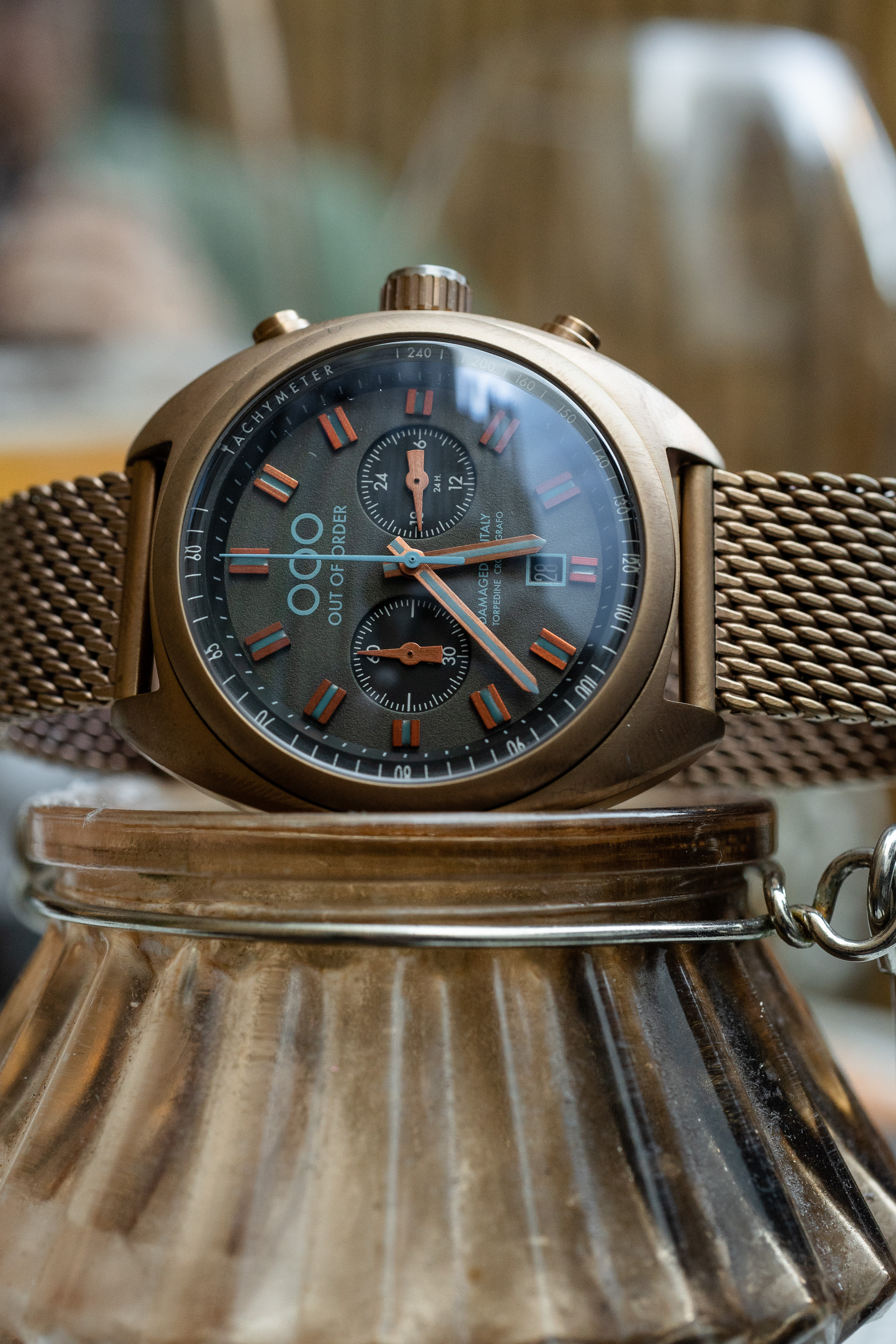 Под сапфировым стеклом скрыт чёрный матовый циферблат с контрастными часовыми индексами цвета Тиффани. Дизайн дополняют полезные функции: тахиметрическая шкала, секундомер и окошко даты — все элементы органично вписаны в общую композицию. Браслет миланского плетения изготовлен вручную и оснащён дополнительной фиксацией на застёжке?бабочке.