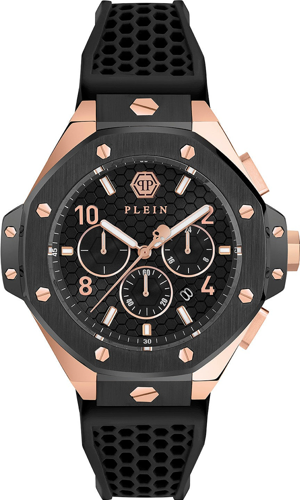 Philipp Plein. Присутствует окошко даты. Дополнительно на малом циферблате отображается текущее время в 24-х часовом формате. Граненая заводная головка. Ремешок с классической застежкой. Гарантия 2 года.