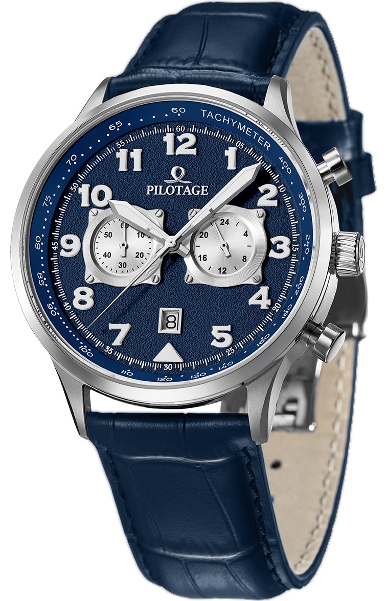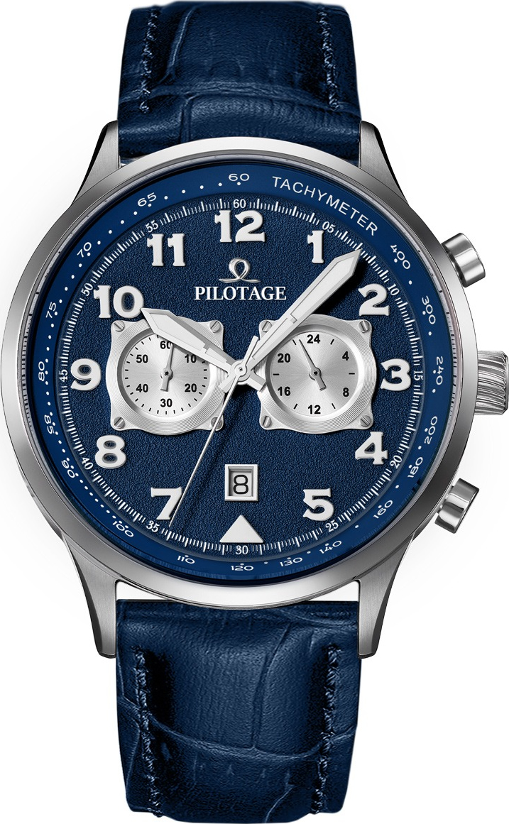 Часы Pilotage Biplane Chrono - мужские наручные часы в авиаторской стилистике, вдохновлённые эстетикой бипланов и духом пилотирования. Модель оснащена кварцевым механизмом Miyota OS21 японского производства, выполняющим функции хронографа: центральная стрелка отсчитывает секунды, счётчик на отметке «9 часов» фиксирует минуты, дополнительно присутствуют 24-х часовой индикатор и окошко даты. Корпус диаметром 43,5 мм выполнен из нержавеющей стали с комбинированной отделкой — зеркальной полировкой верхних граней и вертикальным брашированием боковых поверхностей. Циферблат с текстурой, напоминающей взлётную полосу, защищён сапфировым стеклом, практически неуязвимым для царапин. Для отличной читаемости в темноте крупные арабские цифры и стрелки покрыты люминесцентным составом; вместо цифры «6» размещён стилизованный указатель высотомера. На внутреннем кольце циферблата нанесена тахиметрическая шкала, а индикаторы хронографа и 24-х часового формата выделены накладными пластинами с декоративной гравировкой, полировкой «солнечные лучи» и винтами. Заводная головка имеет спиральный рельеф и украшена логотипом бренда, отсылающим к «мёртвой петле». Завинчивающаяся задняя крышка обеспечивает водозащиту 10 бар (100 м) и декорирована гравировкой с изображением самолёта и надписью «Let’s fly!». Ремешок из натуральной кожи оснащён раскладывающейся застёжкой-клипсой с двумя боковыми кнопками для надёжной фиксации. В комплект входят индивидуальная упаковка, паспорт и двухлетняя гарантия. Часы сочетают функциональность хронографа, прочность материалов и выразительный дизайн, подчёркивающий связь с авиационной тематикой. Гарантия 2 года.
