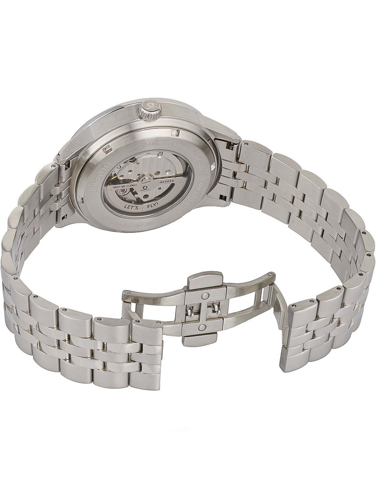 Часы оснащены сапфировым стеклом, обеспечивающим превосходную защиту от царапин, и завинчивающейся задней крышкой с гравировкой летящего в облаках самолета и лозунгом “Let’s fly!”, отражающим философию бренда. Водонепроницаемость составляет 10 атмосфер (100 метров), что позволяет использовать часы при плавании.