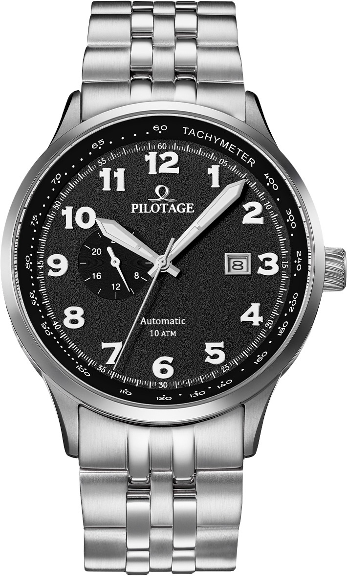 Циферблат с особой текстурой, напоминающей покрытие взлетной полосы, украшен крупными арабскими цифрами и стрелками, покрытыми люминесцентным составом для оптимальной читаемости в любое время суток. На внутреннем кольце циферблата расположена тахиметрическая шкала, а дополнительное окошко даты выделено накладной полированной рамкой.