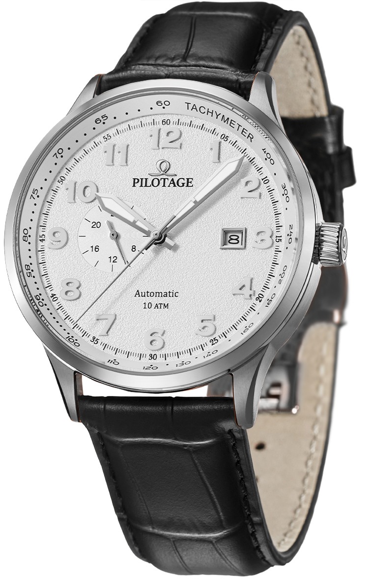 Циферблат с особой текстурой, напоминающей покрытие взлетной полосы, украшен крупными арабскими цифрами и стрелками, покрытыми люминесцентным составом для оптимальной читаемости в любое время суток. На внутреннем кольце циферблата расположена тахиметрическая шкала, а дополнительное окошко даты выделено накладной полированной рамкой.