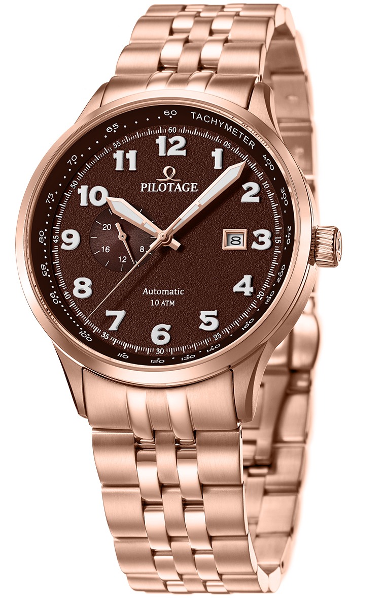 Циферблат с особой текстурой, напоминающей покрытие взлетной полосы, украшен крупными арабскими цифрами и стрелками, покрытыми люминесцентным составом для оптимальной читаемости в любое время суток. На внутреннем кольце циферблата расположена тахиметрическая шкала, а дополнительное окошко даты выделено накладной полированной рамкой.