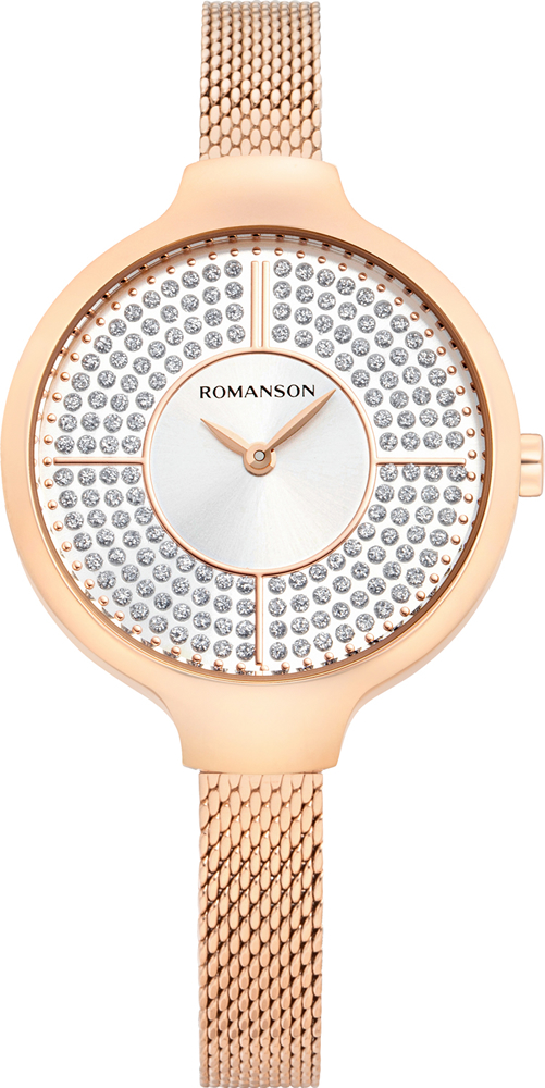 Очаровательные женские наручные часы Romanson. Циферблат украшен кристаллами. Браслет из нержавеющей стали выполнен в технике миланского плетения. Гарантия 1 год.