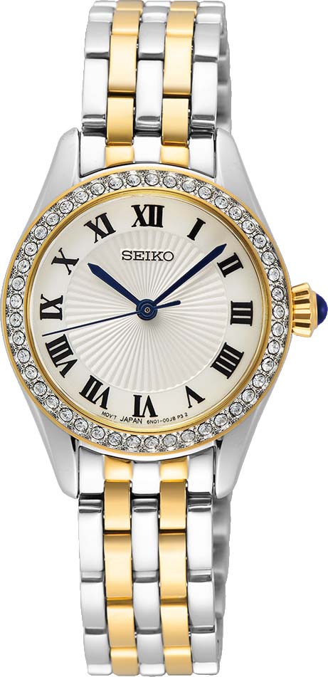 Классическая модель женских наручных часов на браслете от Seiko. Корпус украшен кристаллами Swarovski. Циферблат с римскими цифрами закрывает выпуклое минеральное стекло Hardlex повышенной прочности. Браслет с тройной раскладывающейся застежкой. Вес часов 52 грамма. Гарантия 2 года.